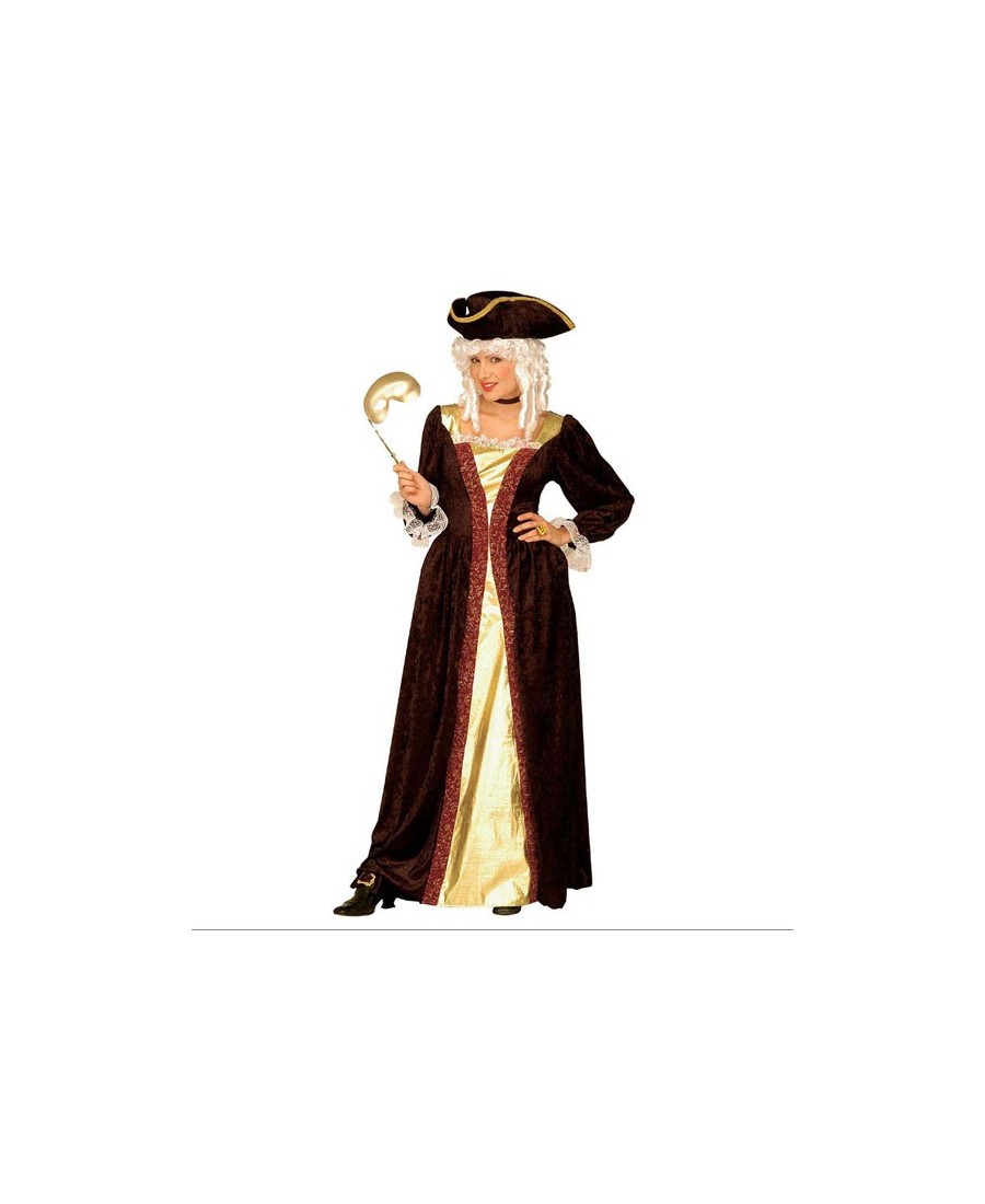 Compuesto por un bonito vestido de terciopelo elástico decorado en la parte central y un Tricornio negro con borde dorado.