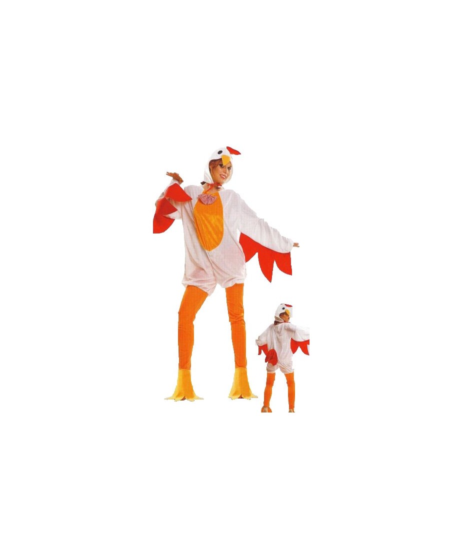 Compuesto por Traje de Terciopelo fino con Cola y decoraciones en los brazos simulando alas y pajarita, pantalón con Cubrezapatos y un simpático Gorro de Gallina con cresta y pico.