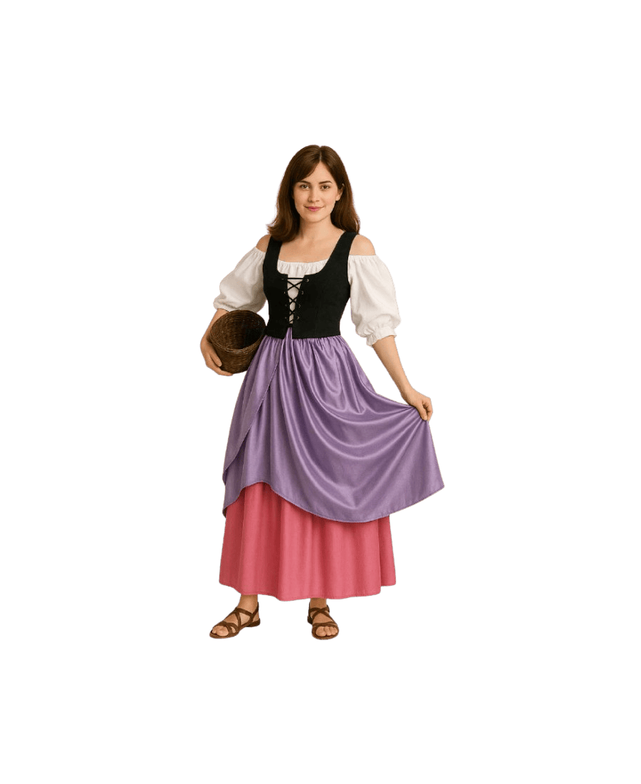 Entre los disfraces medievales para mujer, este modelo destaca por su estética clásica y su combinación de colores que evocan la vestimenta popular de los pueblos medievales.