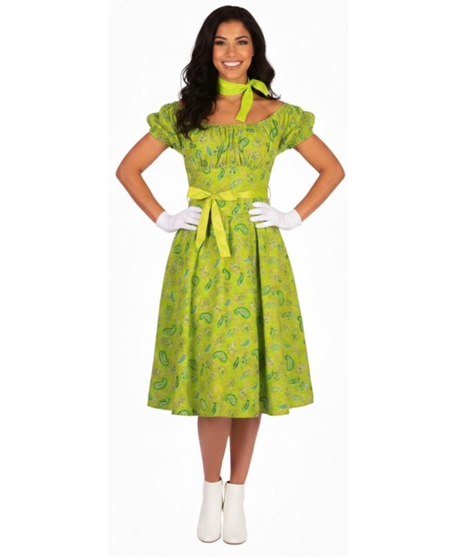 Consigue tu disfraz retro para mujer con vestido, cinturón y pañuelo y luce un estilo vintage lleno de encanto en tu próxima fiesta.