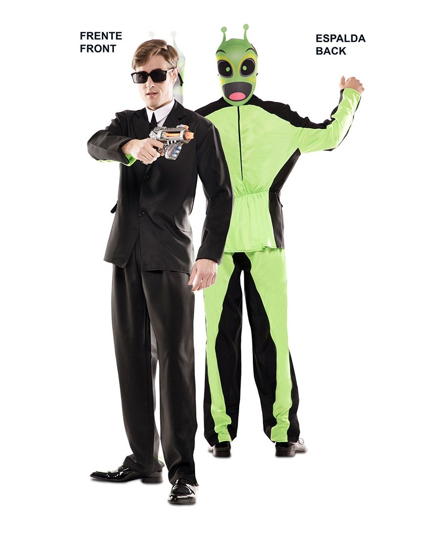 Sorprende a todos tus amigos con este disfraz de doble de alien y traje, un novedoso pero sobre todo muy divertido concepto de disfraz con el que al darte la vuelta te convertirás en ¡ otro personaje!