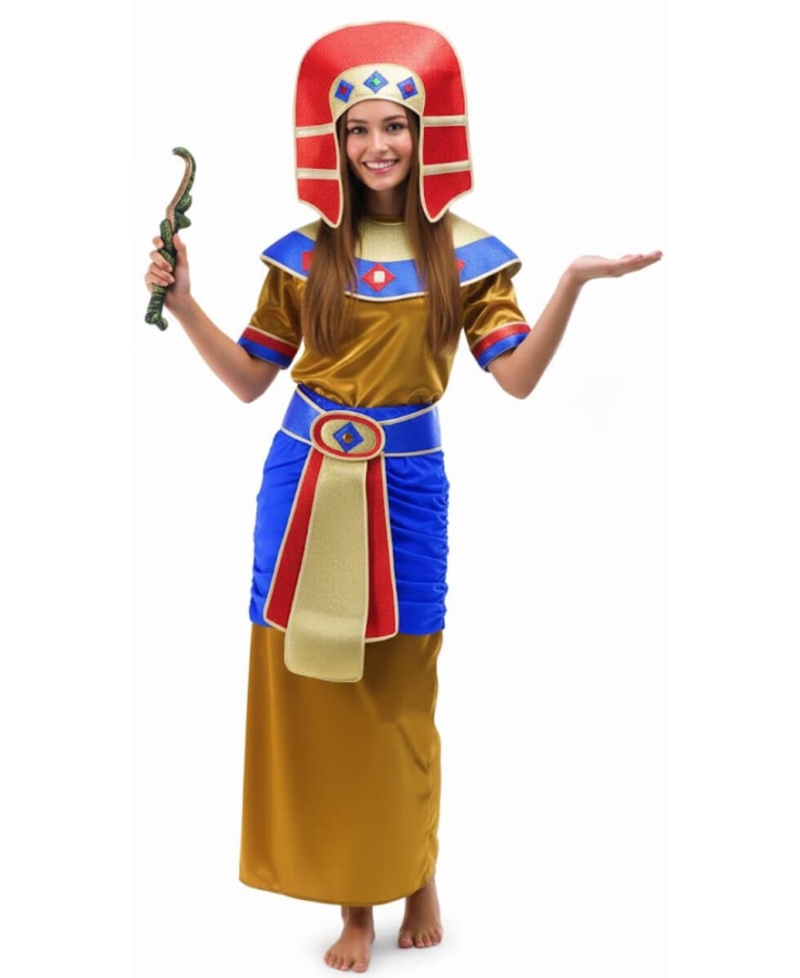 Este traje recrea el estilo majestuoso de las reinas y princesas egipcias con un diseño colorido lleno de detalles decorativos.