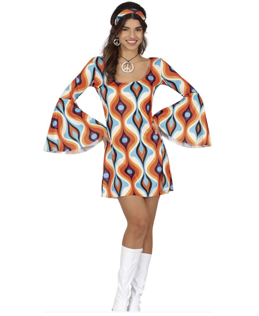 DISFRAZ DE AÑOS 70 PSICODELICO NARANJA Y AZUL PARA MUJER