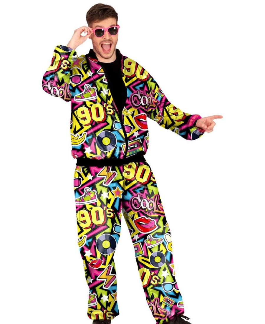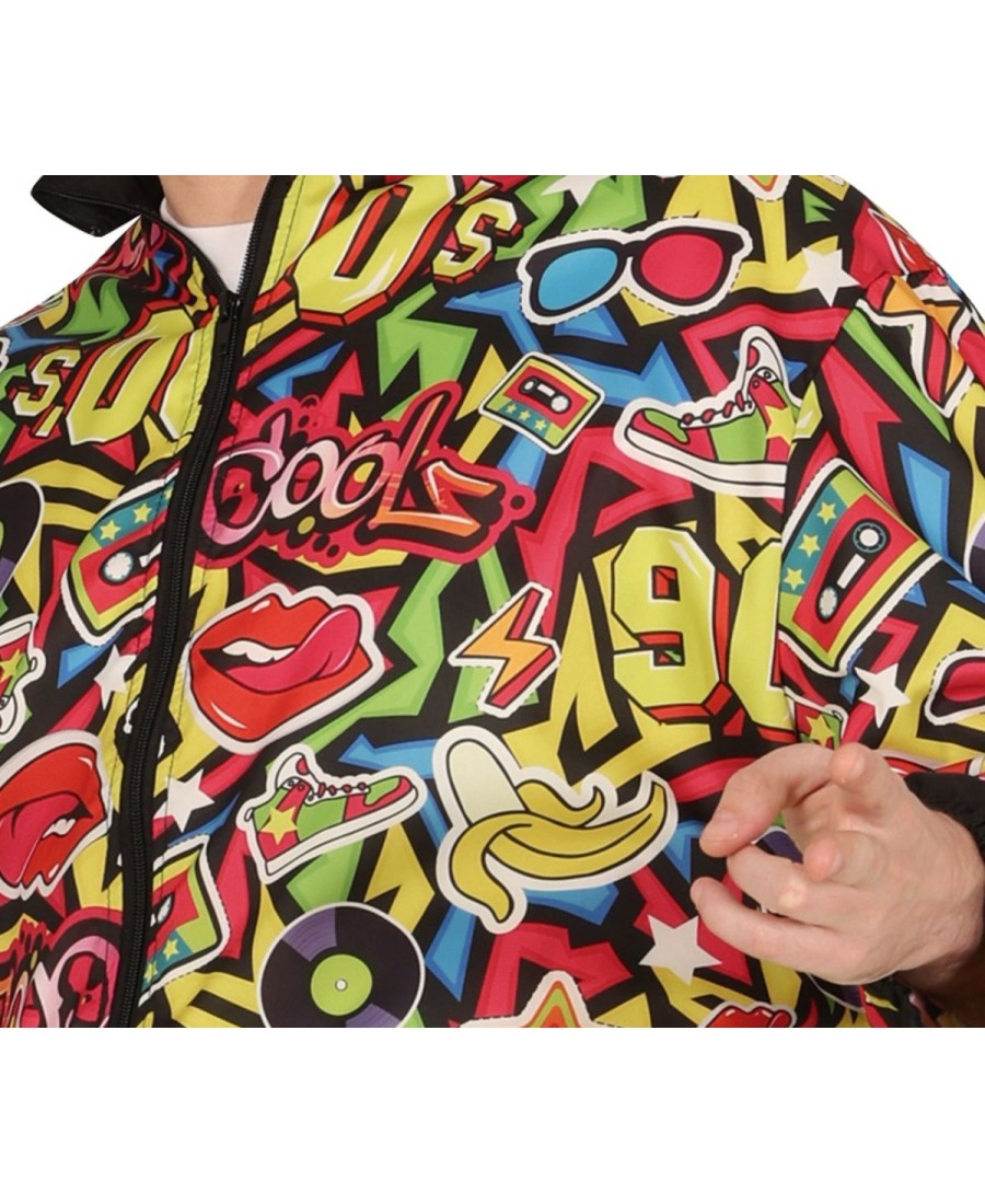 El conjunto incluye una chaqueta y pantalones llenos de estampados vibrantes y llamativos que evocan los grafitis, la cultura pop y las tendencias más icónicas de la década. Además, el disfraz es ligero y cómodo, ideal para moverte y bailar al ritmo de los mejores éxitos de los 90.