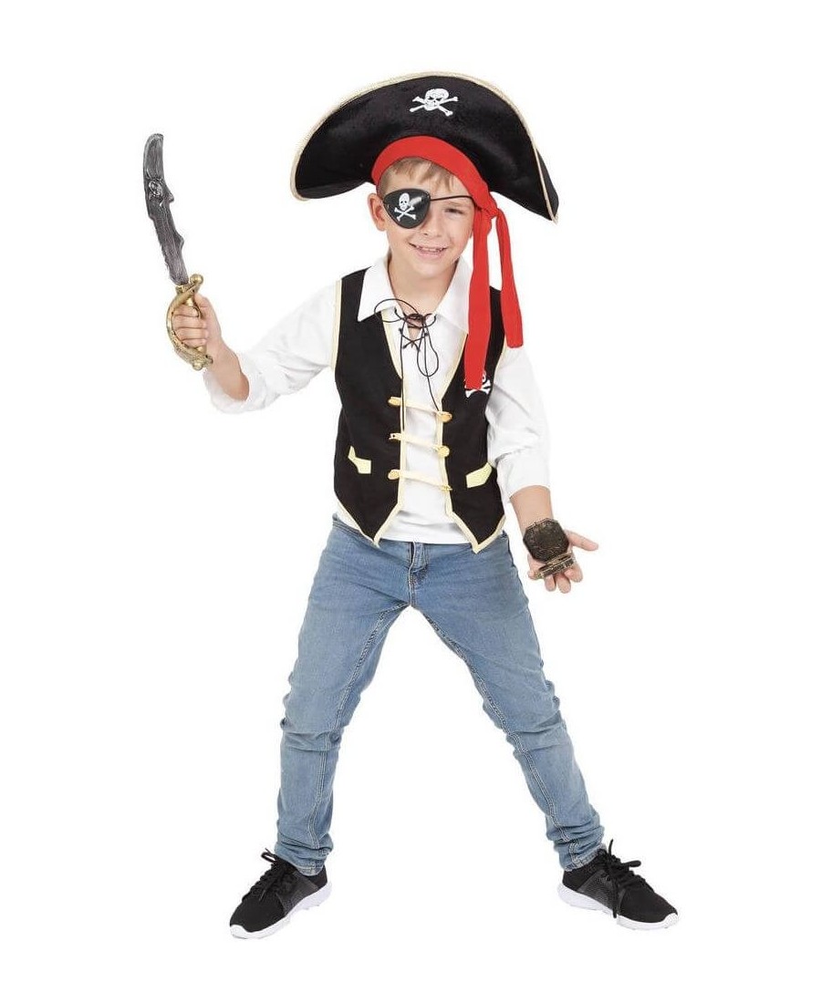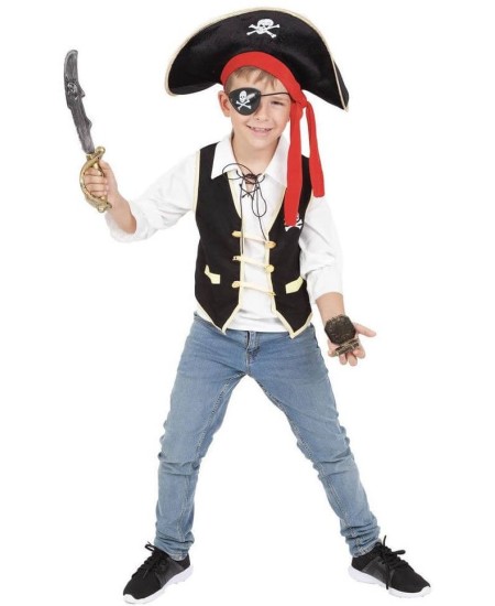 El set incluye todo lo necesario para que tu hijo luzca como un pirata de película: camisa blanca con cordones, chaleco negro con detalles dorados, un llamativo sombrero con calavera, parche para el ojo, una brujulita para las aventuras y una espada de juguete para completar el look.