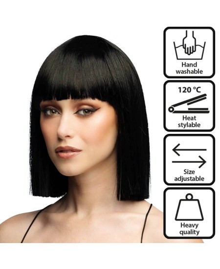 Si buscas un accesorio que transforme tu look de forma instantánea, esta peluca negra corta con flequillo recto estilo bob es la elección ideal. Con un acabado brillante y natural, aporta un aire sofisticado, sexy y atemporal, perfecto tanto para fiestas, eventos de noche, disfraces o cosplay.