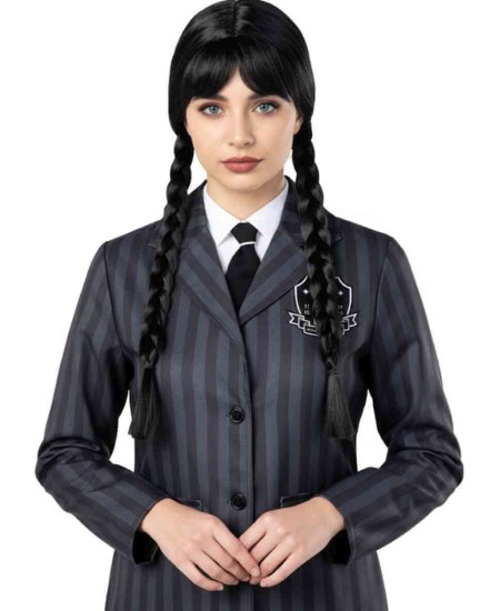 Compra ahora tu peluca de Miércoles Addams y transforma tu look en segundos para convertirte en la estudiante más siniestra de Nevermore Academy.