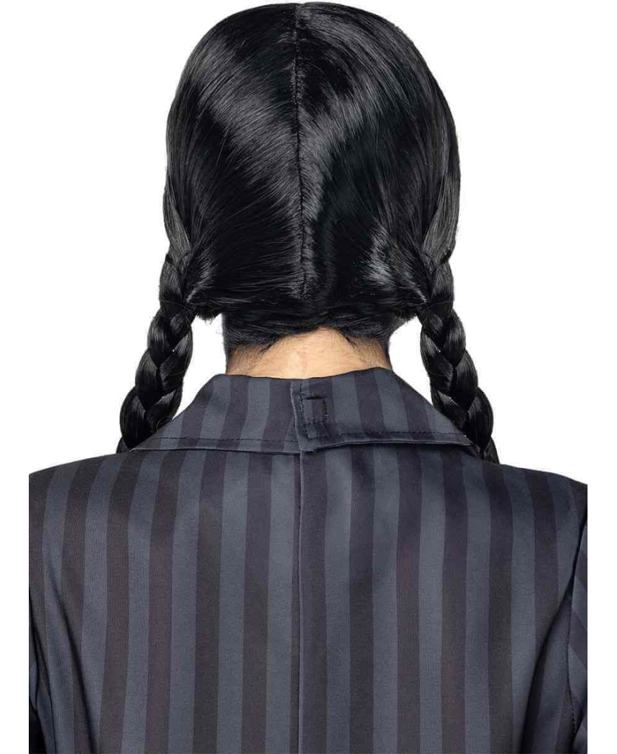 Esta auténtica peluca de Miércoles Addams adulto es el complemento ideal para completar tu disfraz del personaje más oscuro y fascinante de la familia Addams.