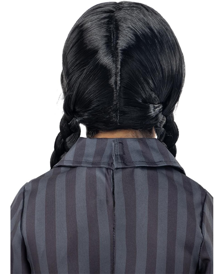 Compra ahora tu peluca de Miércoles niña y deja que brille con su estilo oscuro y elegante en la noche más terroríficamente divertida del año.