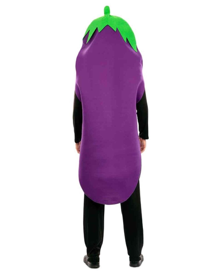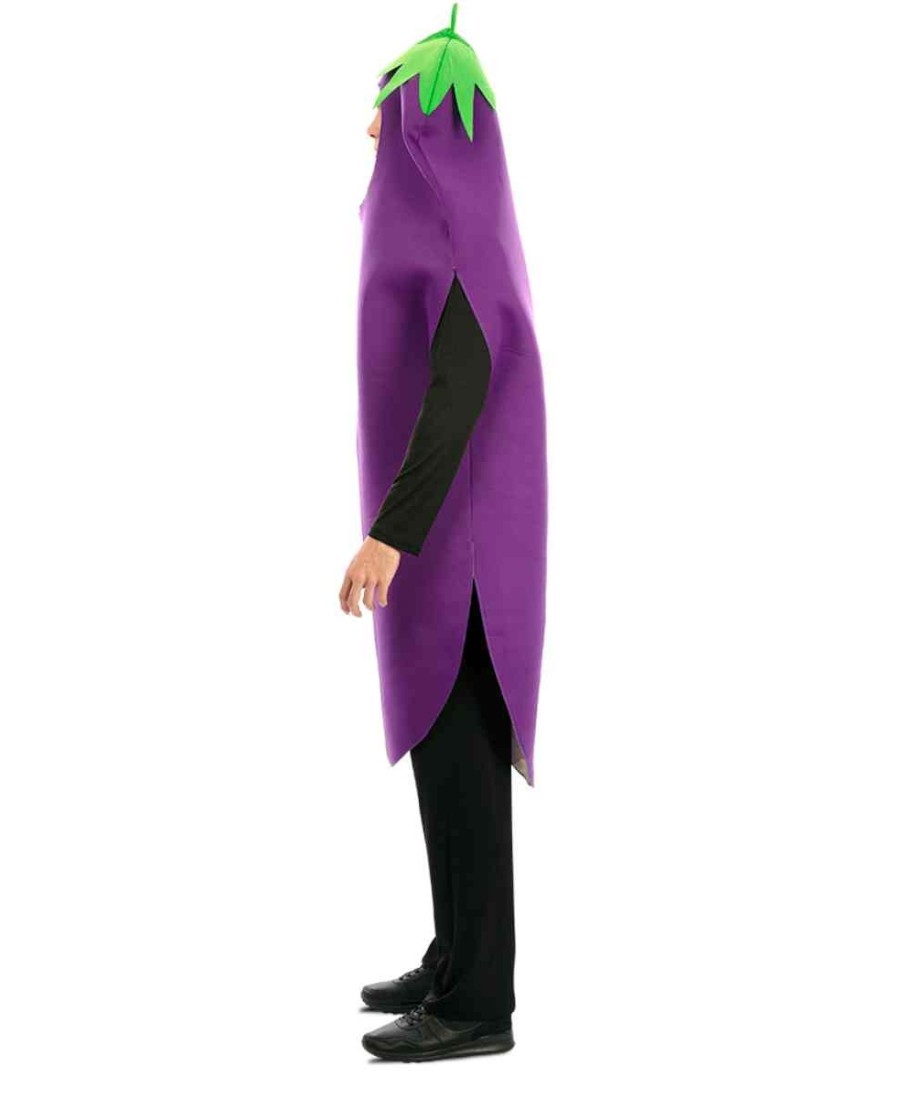 El disfraz de berenjena para adulto incluye: traje acolchado de color morado con detalle verde en la parte superior y abertura para la cabeza.