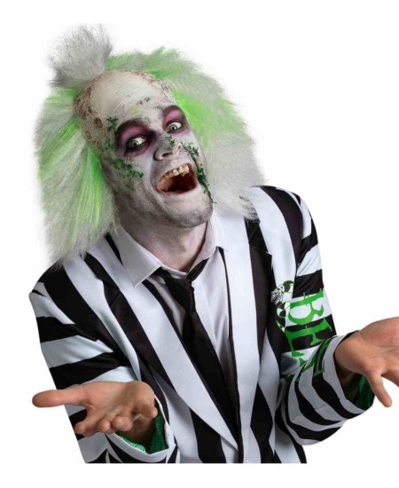 Dentro de nuestra colección de accesorios de disfraces de Halloween para adultos, este modelo destaca por su acabado realista, que reproduce a la perfección el icónico look de Beetlejuice con su calva envejecida y su cabello desordenado en tonos blanco y verde.