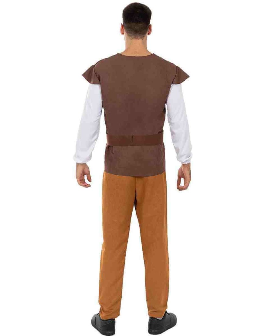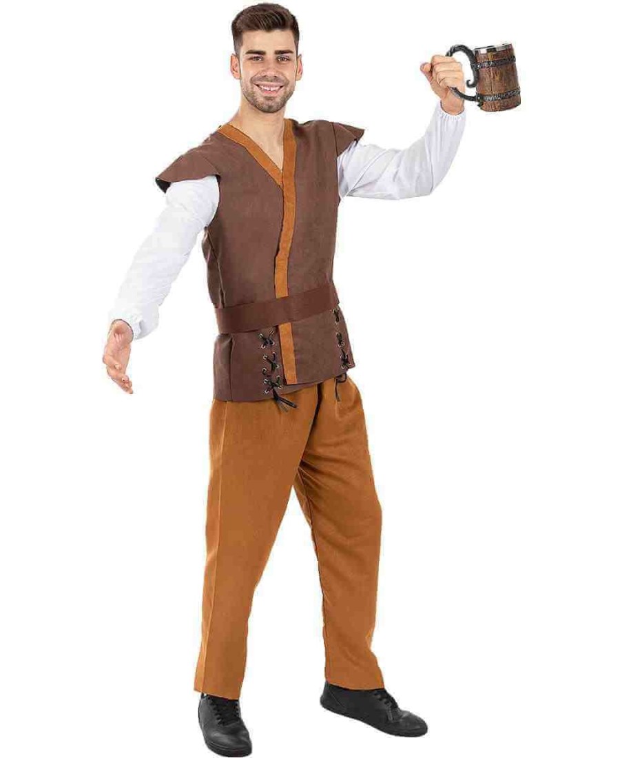 El traje combina tonos tierra y detalles rústicos que evocan la moda tradicional de la Edad Media. El chaleco marrón con cordones laterales, junto con la camisa blanca y el cinturón ancho, aportan autenticidad al conjunto. Los pantalones en color ocre completan un look cómodo, resistente y con un aire histórico perfecto para quienes disfrutan de los disfraces con carácter y realismo.