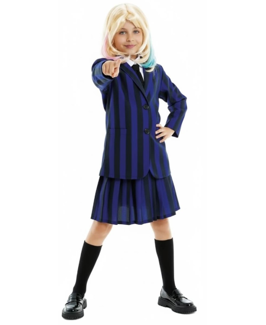 Dale un toque colorido y original a Halloween con este disfraz de Enid para niña, inspirado en la divertida compañera de Miércoles Addams en la famosa serie. Su diseño reproduce el uniforme del colegio Nevermore, con chaqueta y falda de rayas azul y negro, transmitiendo el estilo alegre y moderno del personaje.