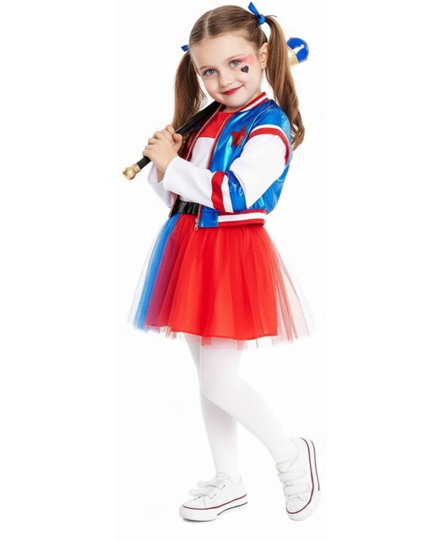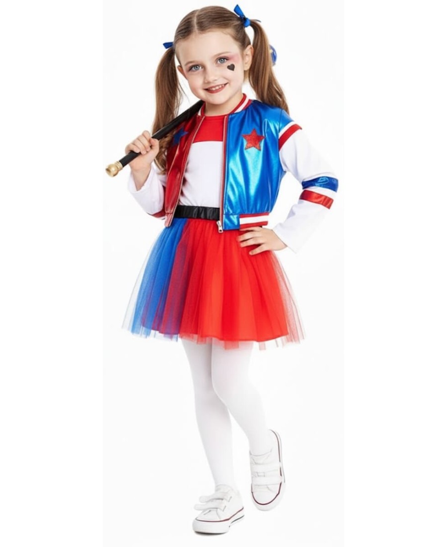 El diseño incluye una chaqueta brillante, falda de tul bicolor y camiseta a juego, creando un conjunto alegre y moderno ideal para Carnaval, fiestas temáticas o Halloween. Perfecto para niñas con una personalidad fuerte y divertida, este disfraz de Harley para niña hará que se sienta la protagonista de su propia aventura.