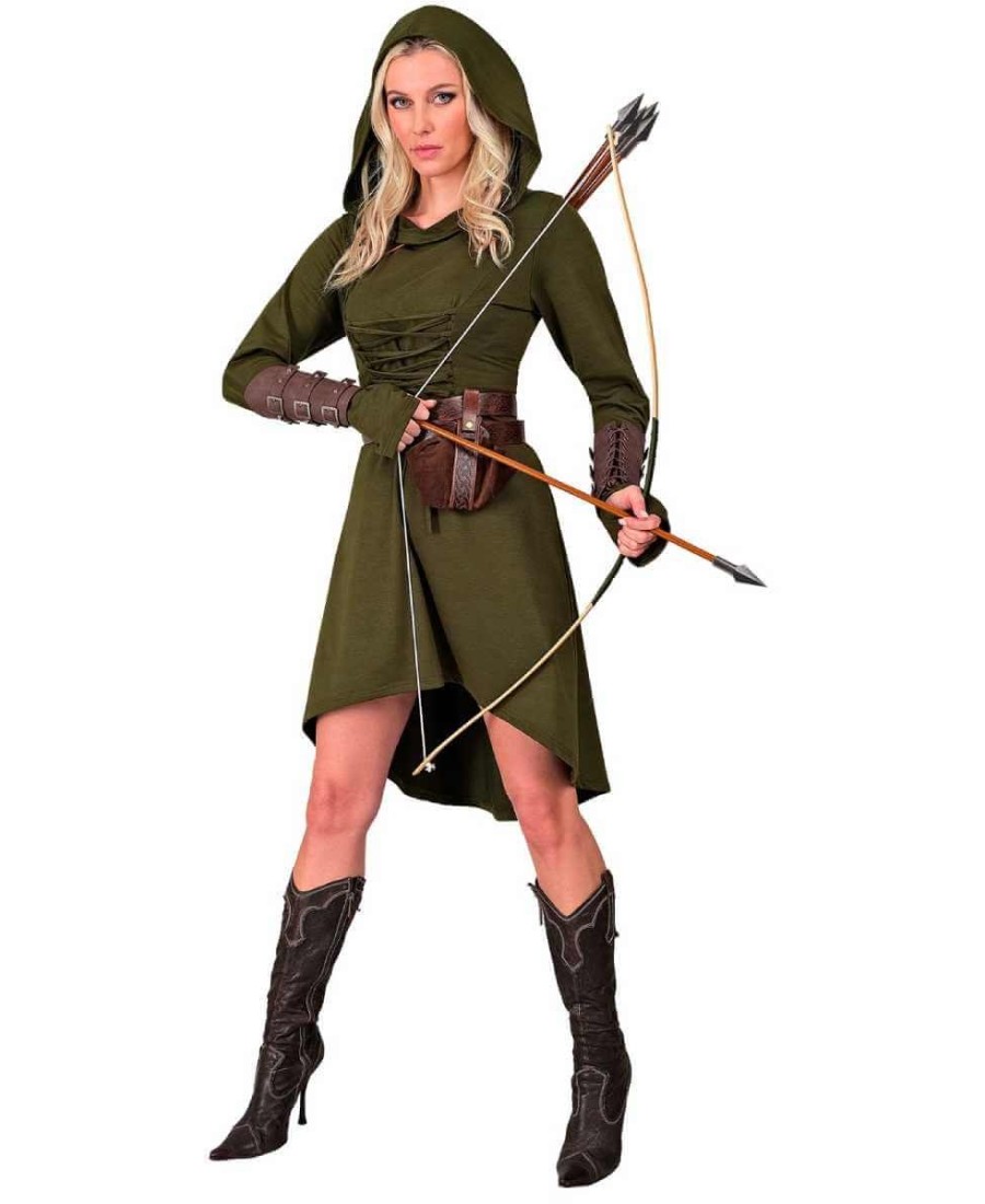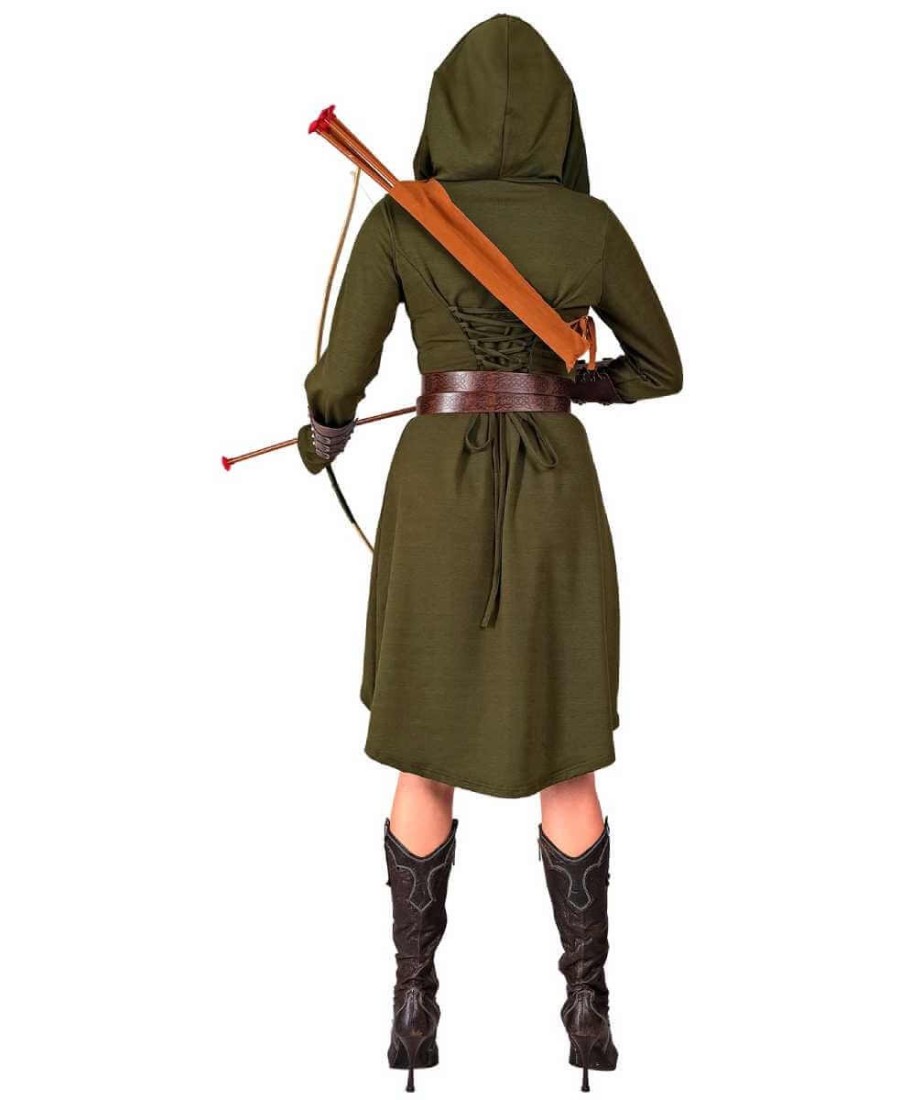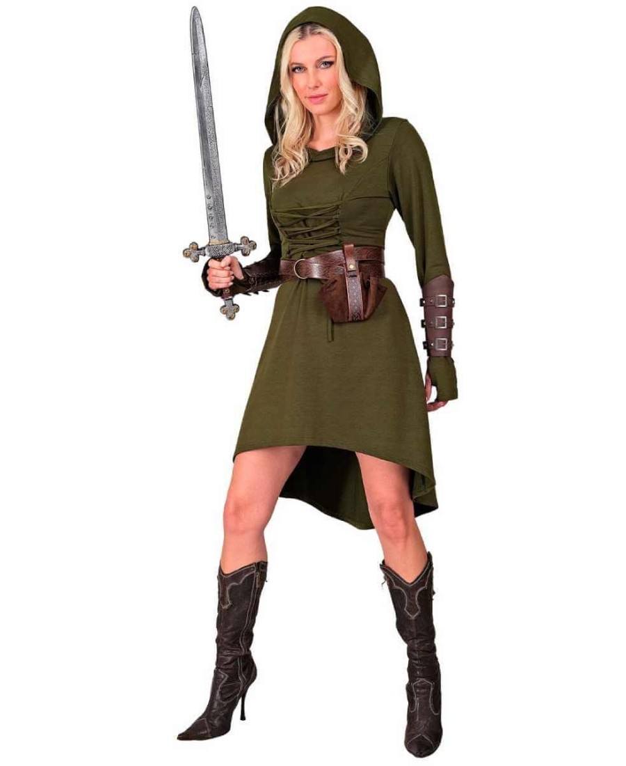 El vestido verde con capucha evoca el misterio del bosque, mientras que los accesorios en tonos cuero aportan un aire de batalla y autenticidad. Ideal para quienes buscan un disfraz femenino pero poderoso, con un toque medieval irresistible.