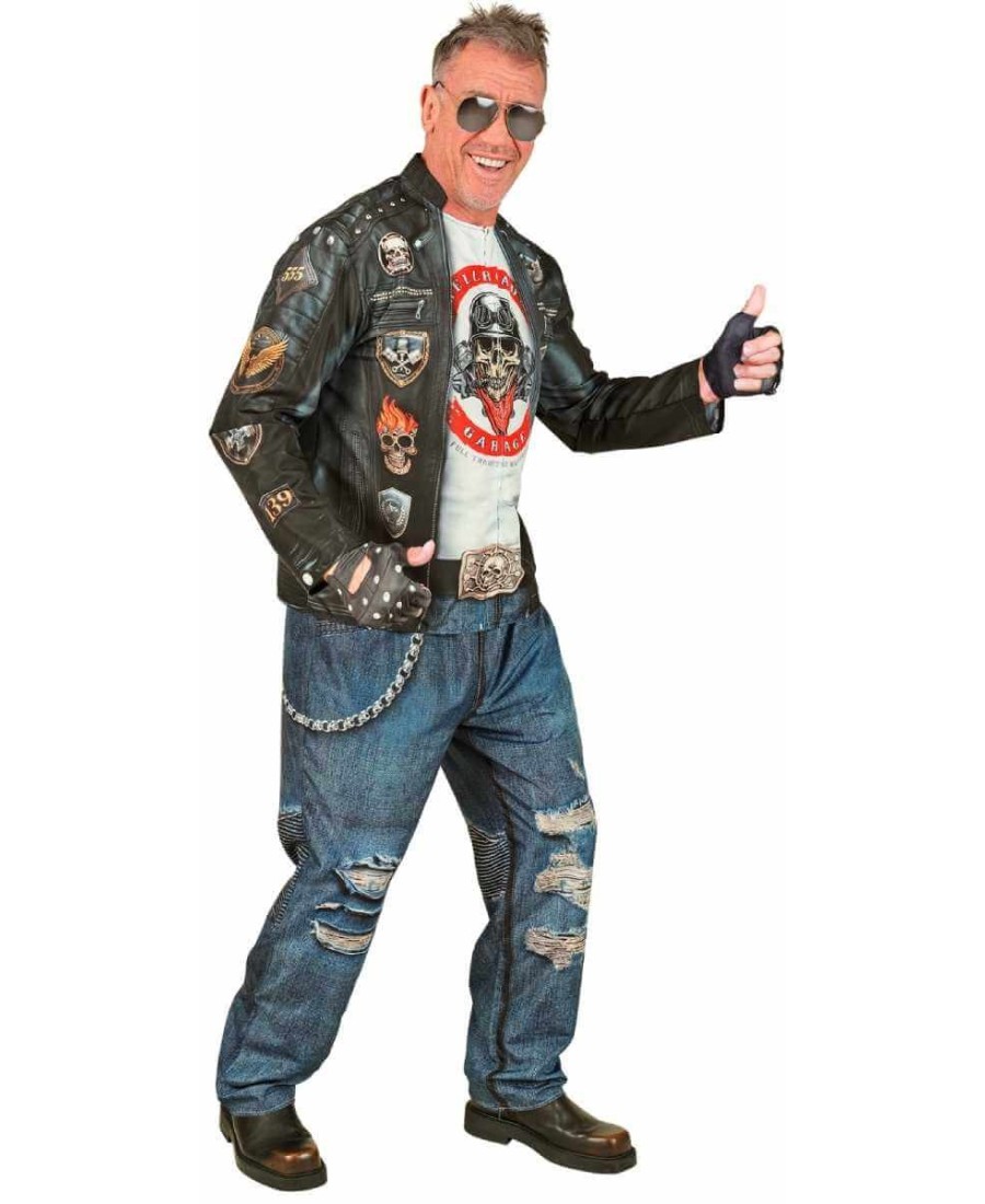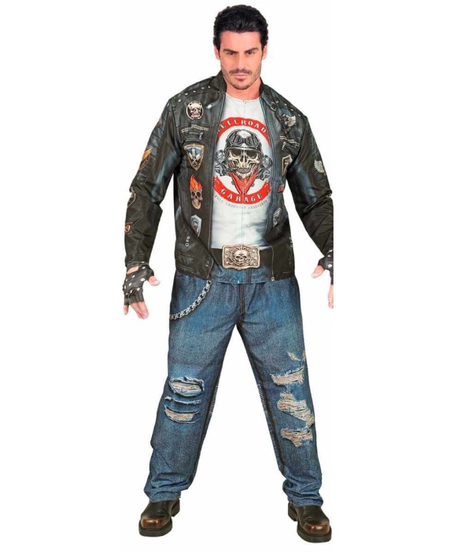 Saca tu lado más rebelde con este disfraz de motero para hombre, perfecto para los amantes de la velocidad, el cuero y la actitud rockera. Su diseño imita a la perfección el estilo de los auténticos motoristas: una chaqueta negra con estampados de calaveras, jeans desgastados y detalles metálicos que le dan un toque salvaje e imponente.