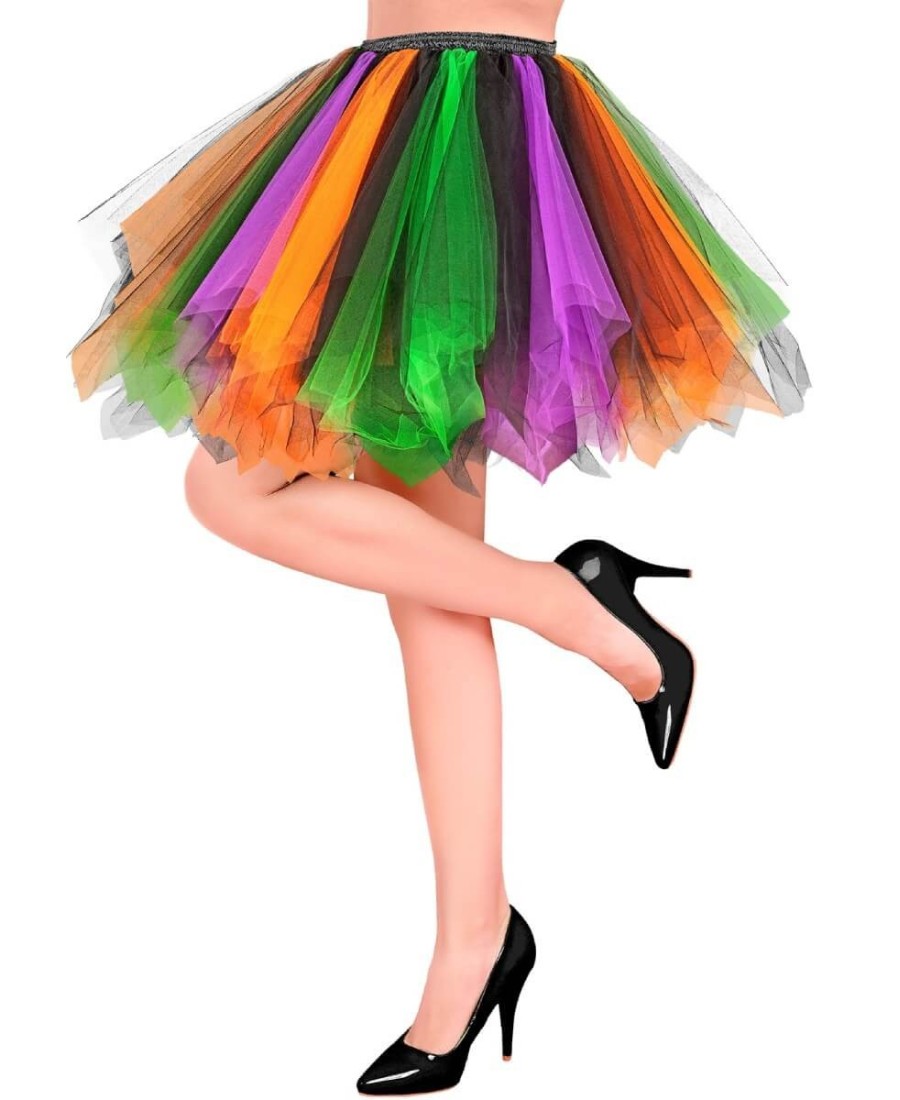 Dale un toque mágico y divertido a tu look con este tutú de Halloween multicolor para mujer. Su diseño combina capas de tul en tonos morado, verde, naranja y negro, creando un efecto voluminoso y llamativo ideal para destacar en cualquier fiesta.