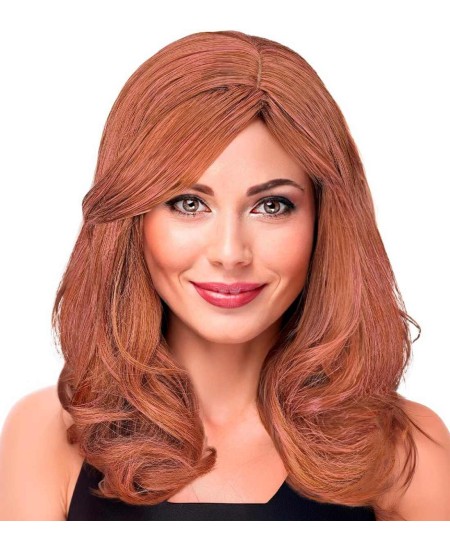 El tono cobrizo aporta luminosidad y estilo, mientras que su diseño con raya central y ondas ligeras garantiza un aspecto realista y cómodo durante horas. Además, su estructura ajustable se adapta fácilmente a diferentes tamaños de cabeza, proporcionando una sujeción segura sin necesidad de adhesivos.