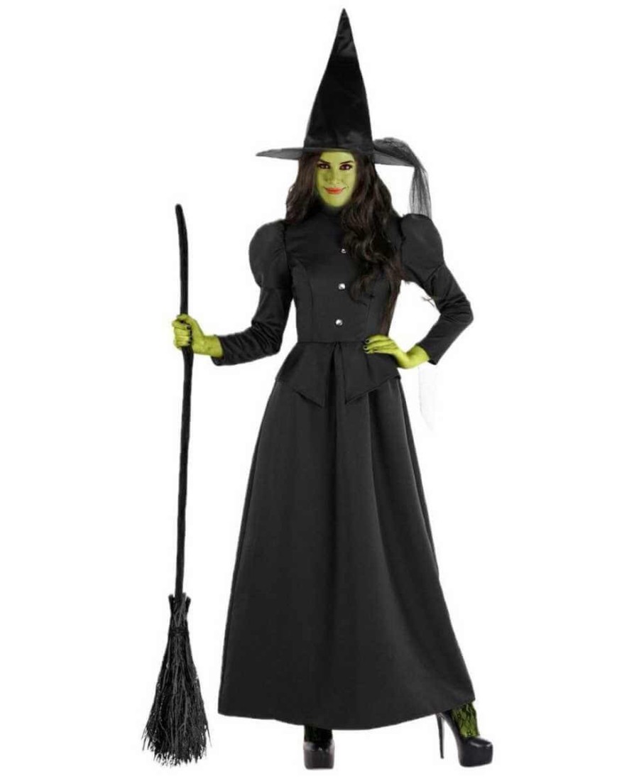 Completa el look con una escoba, maquillaje verde y una peluca oscura para lograr una transformación total.