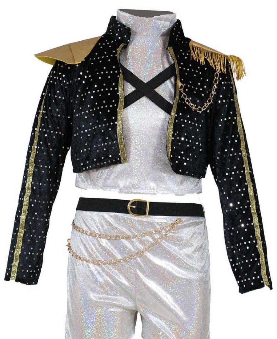 Con su diseño moderno y detalles brillantes, este disfraz es ideal para Carnaval, fiestas temáticas, espectáculos o eventos musicales. Su estilo vanguardista, con toques metalizados y lentejuelas, evoca la imagen de una auténtica diva K-Pop lista para deslumbrar bajo los focos.