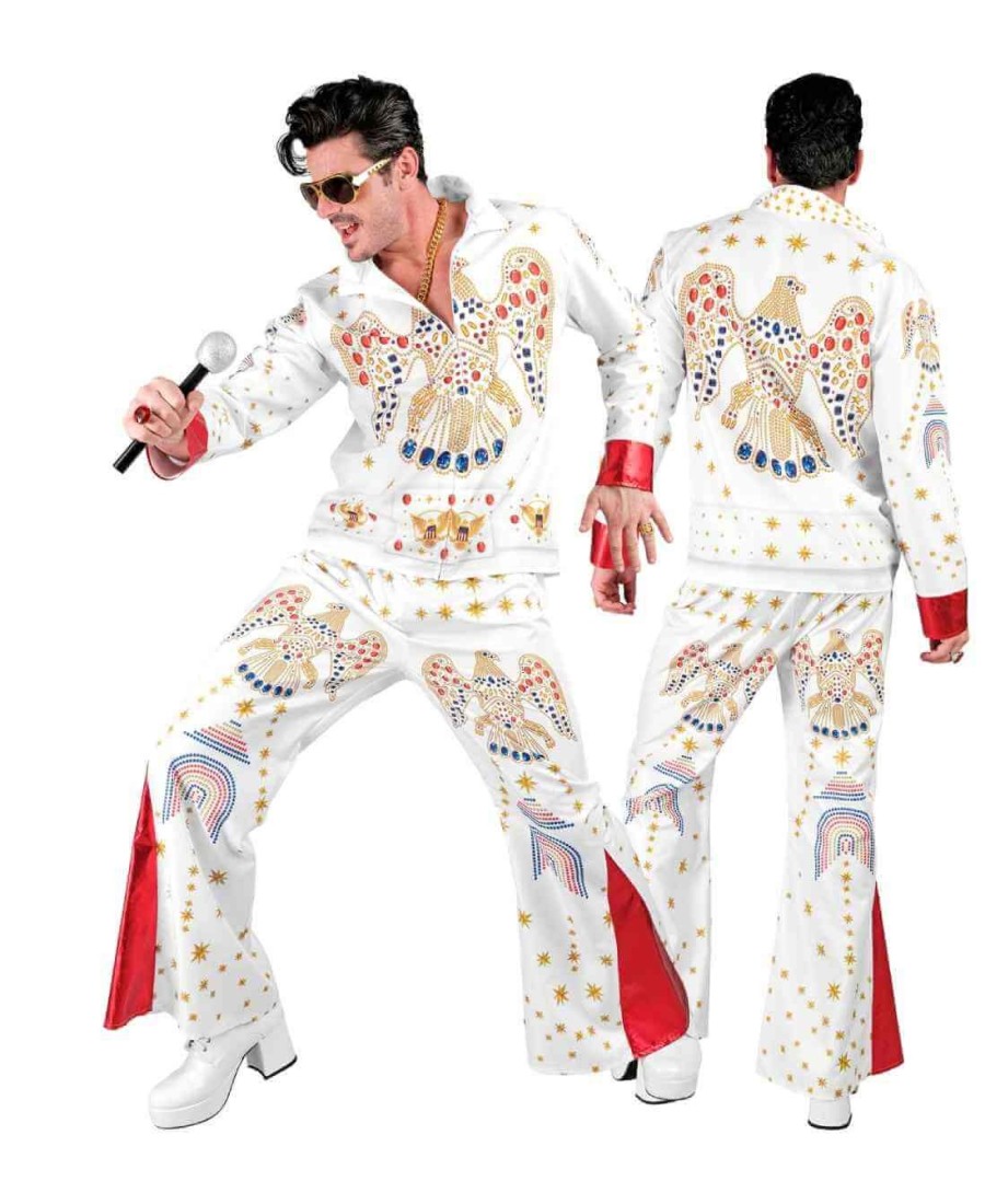 ¡Vuelve el Rey del Rock! Con este espectacular disfraz de Elvis Presley blanco para hombre, revivirás los míticos conciertos de Las Vegas con todo el estilo y la energía del legendario Elvis. El conjunto incluye camisa blanca con adornos dorados y rojos, pantalones acampanados a juego y detalles de águilas bordadas, fiel al icónico traje del Rey.