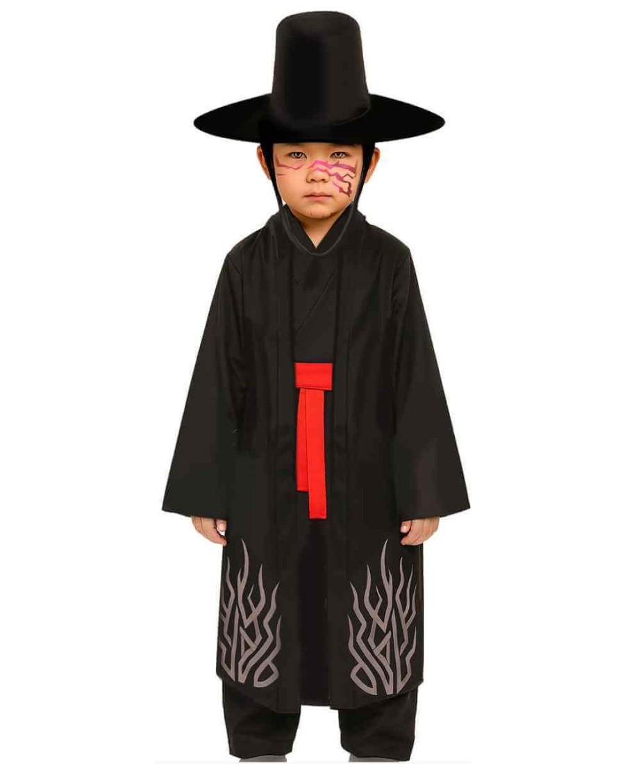 Su estética combina la elegancia tradicional con una presencia poderosa y moderna, creando un disfraz llamativo, cómodo y perfecto para que los niños puedan moverse con total libertad mientras interpretan a un auténtico personaje del universo K-Pop. Además, incluye todos los elementos visibles en la imagen, cuidando cada detalle para lograr un acabado espectacular que no pasará desapercibido.