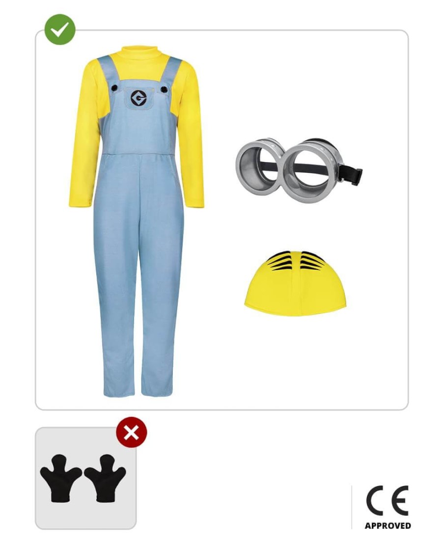 El conjunto viene compuesto por un mono amarillo con peto azul integrado, un gorro amarillo con detalle de pelo simulado y las clásicas gafas de Minion con goma elástica para un ajuste perfecto. Todo diseñado con materiales cómodos, ligeros y seguros para niños.