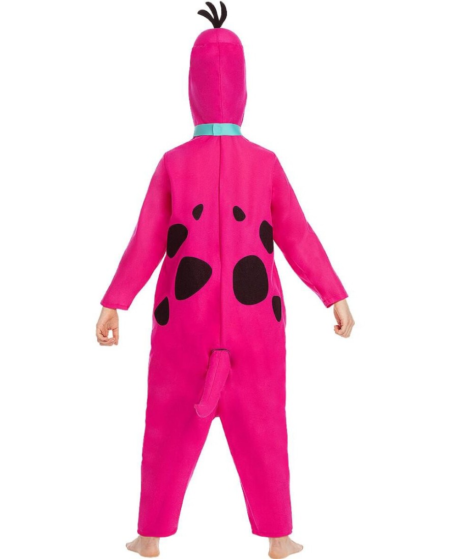 Este disfraz está compuesto por un mono de felpa color rosa fucsia con manchas negras, una cola trasera acolchada, y una capucha con la cabeza de Dino incluida, donde destacan sus ojos, hocico y la divertida cresta superior. Incluye también el clásico collar azul con medallón amarillo, detalle clave del personaje.
