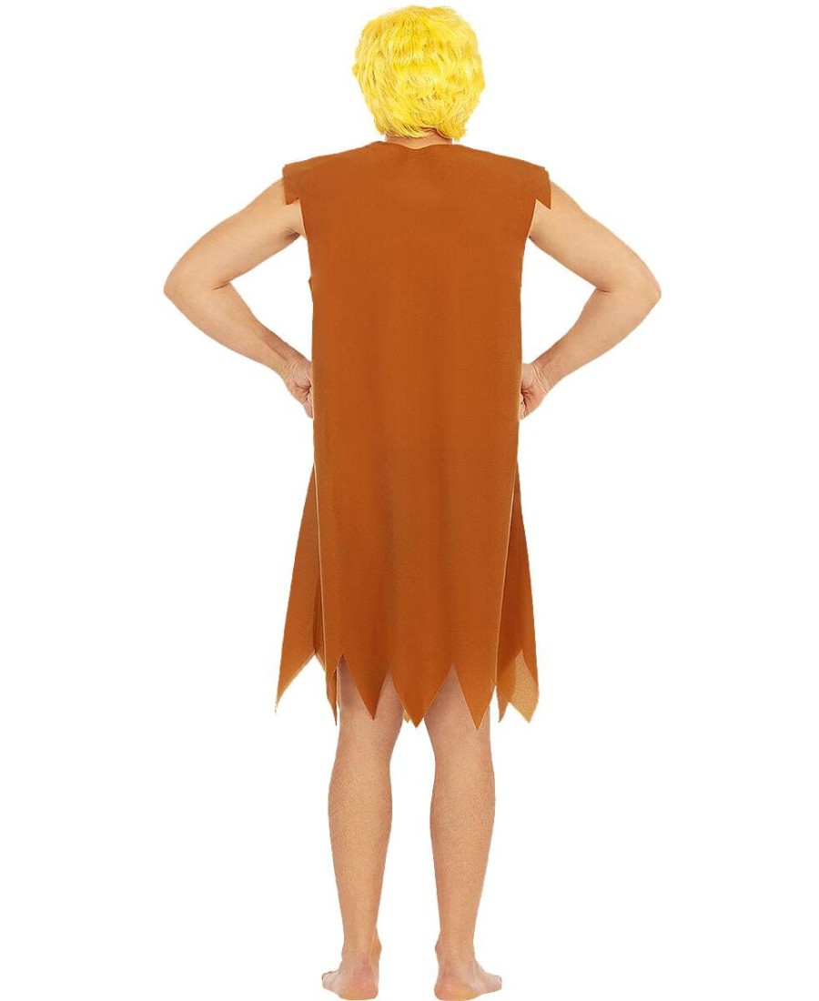 Este modelo incluye una túnica marrón sin mangas con acabado en picos, que simula el atuendo clásico de la Edad de Piedra, y una peluca rubia corta que recrea el inconfundible peinado de Barney (Pablo Mármol en España), aportando autenticidad al look.