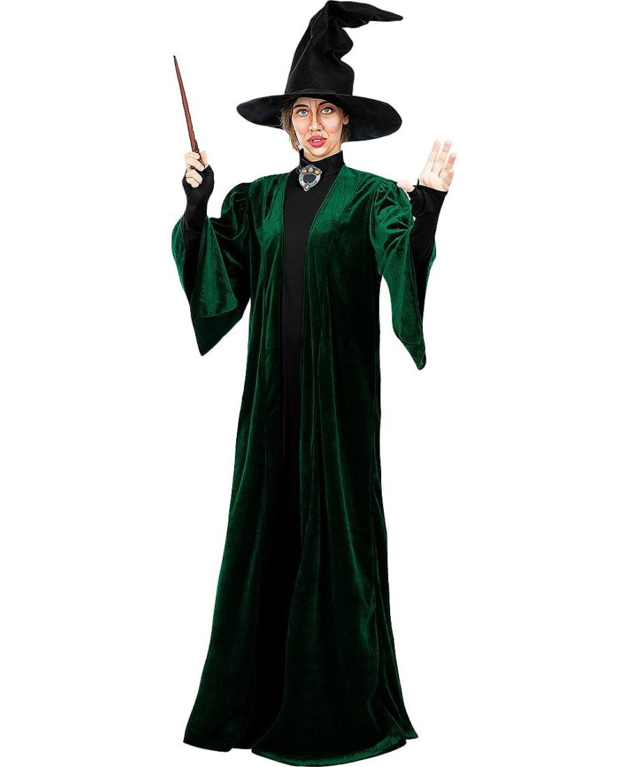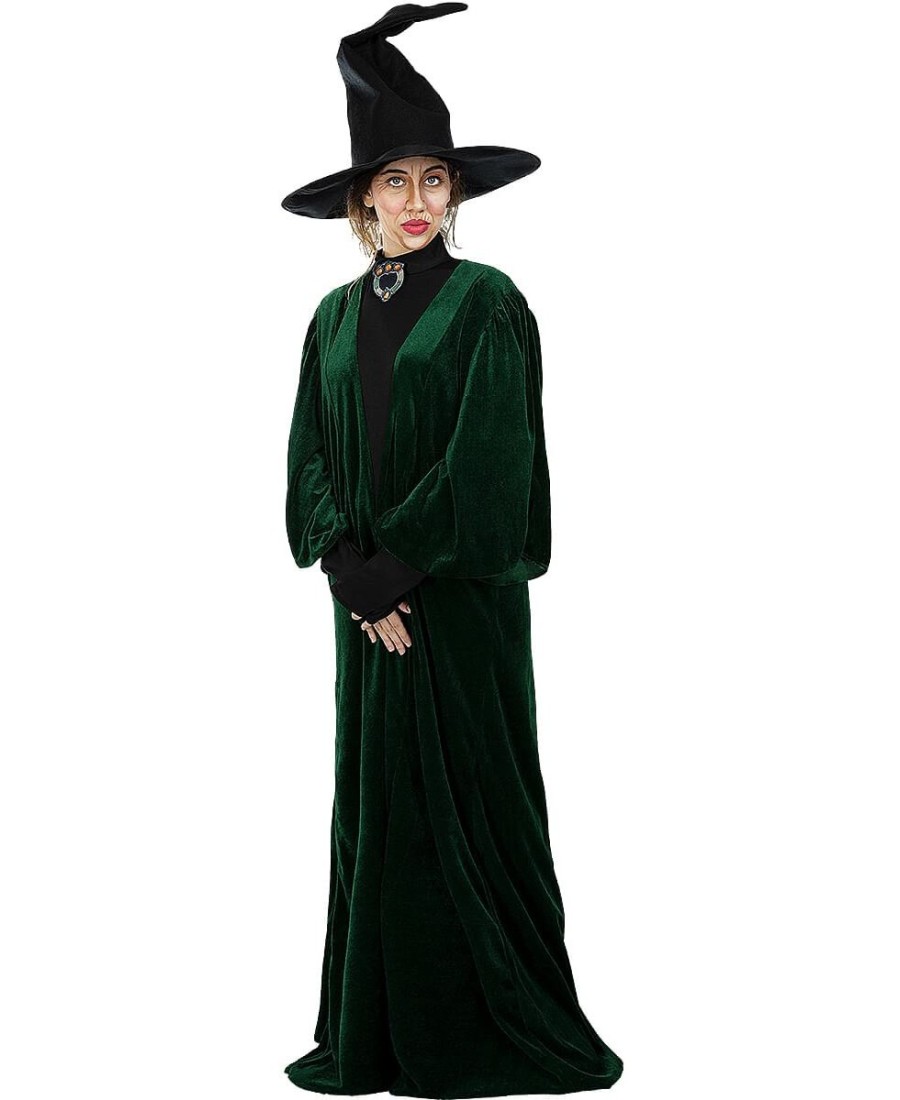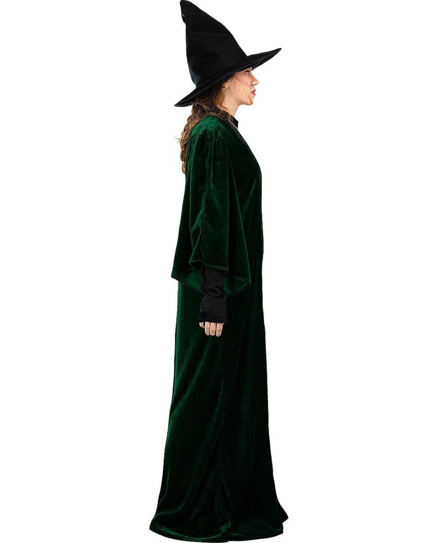 Inspirado en el vestuario original de Minerva McGonagall en las películas de Harry Potter, este traje reproduce con fidelidad su clásico conjunto compuesto por túnica verde de terciopelo, vestido negro largo y sombrero de bruja puntiagudo, capturando la esencia del personaje con gran detalle.