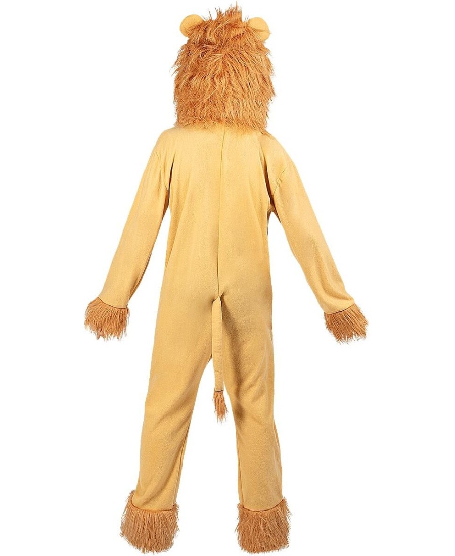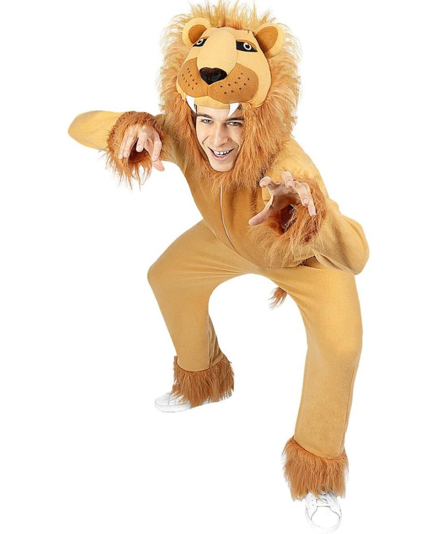 Este modelo incluye un mono de cuerpo entero en tono marrón claro, con detalles de pelaje sintético en puños, tobillos y pecho, además de una cabeza de león integrada con melena, orejas y rostro acolchado. También cuenta con una cola peluda cosida a la parte trasera del traje, completando así un look animal realista y divertido.