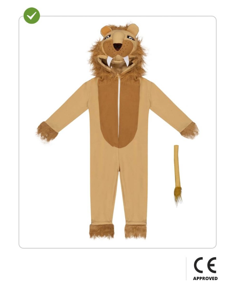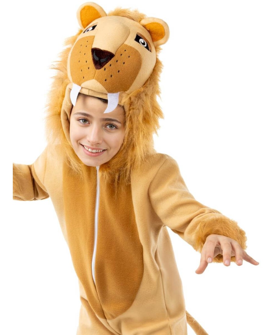 Este disfraz incluye un mono de una sola pieza en tonos marrones, con detalles de pelaje sintético en puños, tobillos y pecho, una cabeza de león acolchada con melena, orejas y colmillos, y una cola peluda incorporada en la parte trasera.