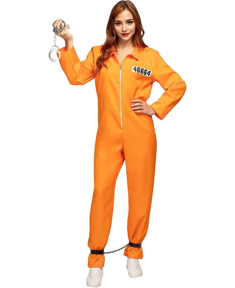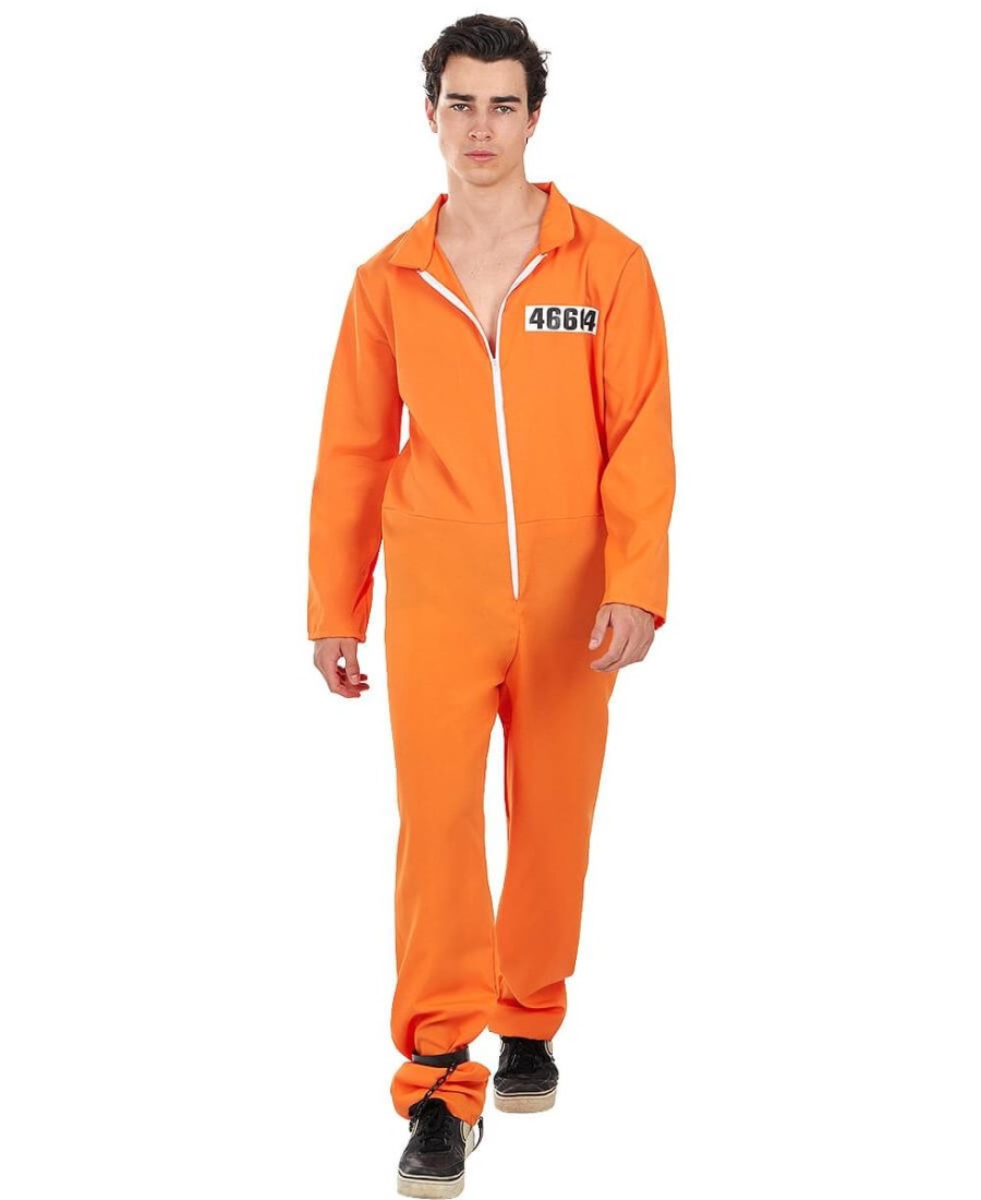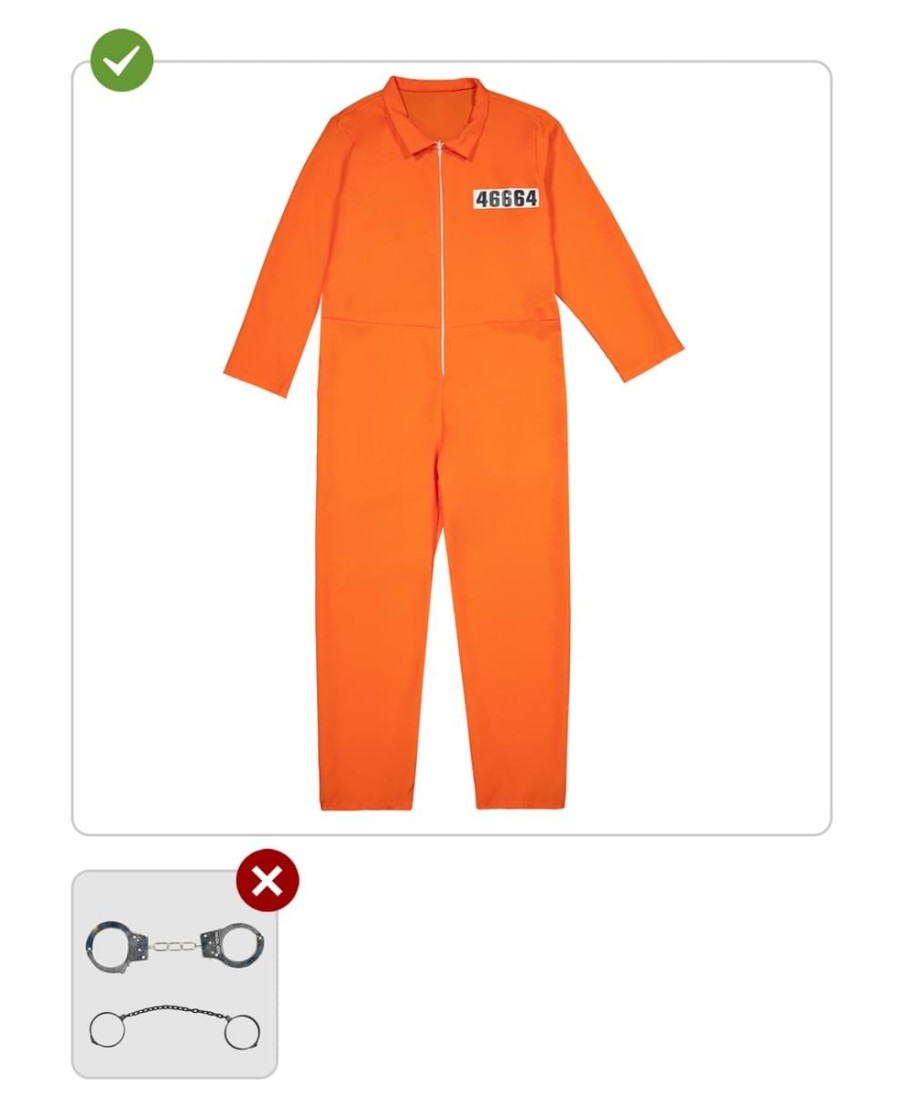 Incluye un mono completo de color naranja con cremallera frontal y número identificativo en el pecho, que simula el uniforme típico de un prisionero. El diseño holgado proporciona comodidad y libertad de movimiento durante toda la fiesta, mientras que su color vibrante no pasará desapercibido.