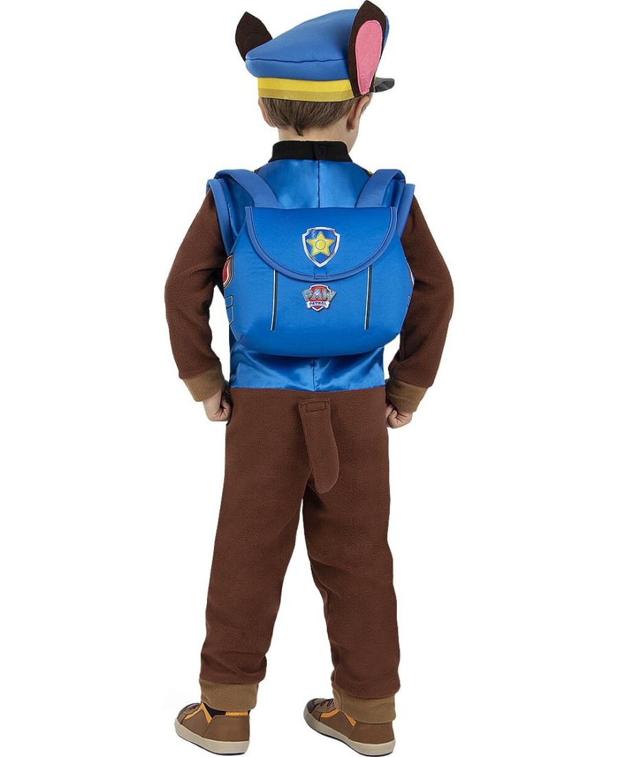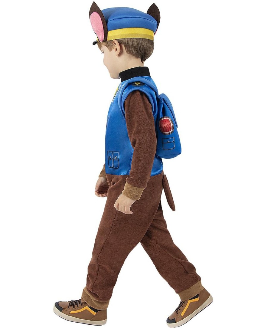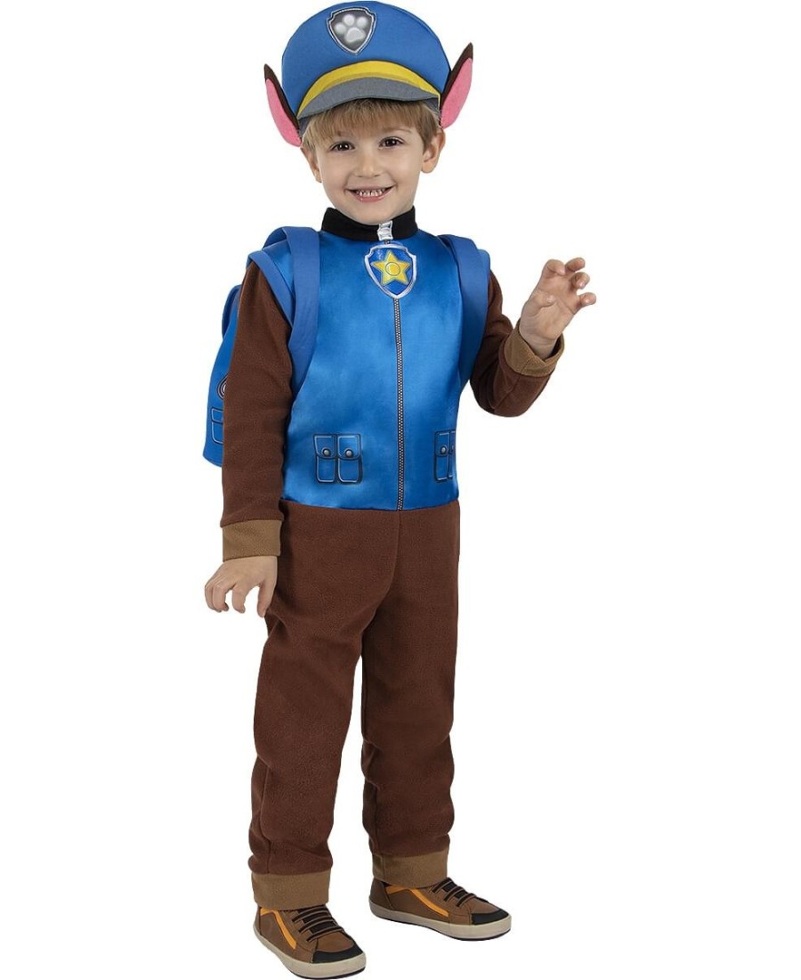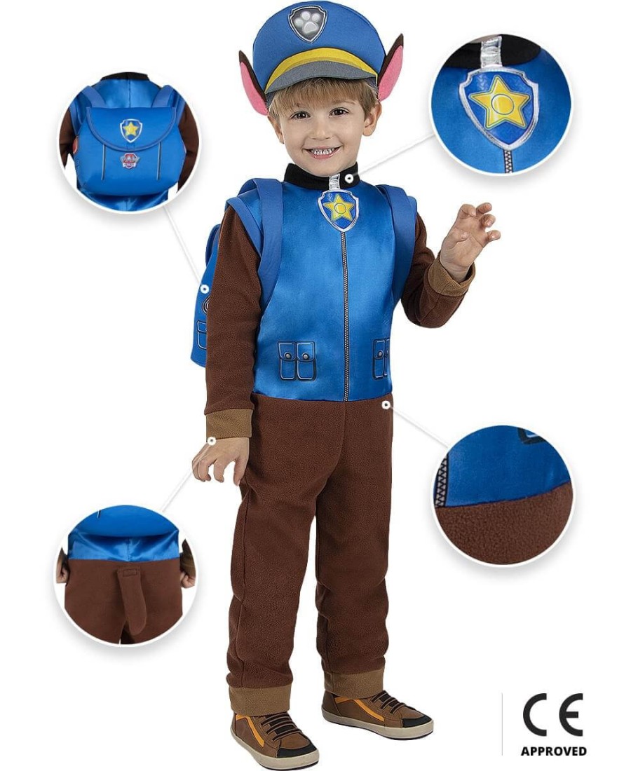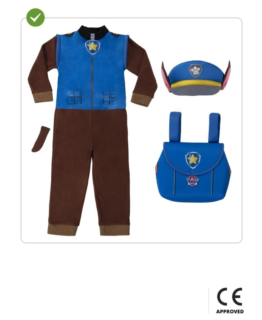 Incluye un mono marrón con detalles azules, cola incorporada, gorro con orejas de perrito y mochila azul a juego, que simulan el uniforme y accesorios característicos de Chase. Gracias a su diseño cómodo y práctico, los niños podrán moverse con total libertad mientras se divierten como auténticos héroes.