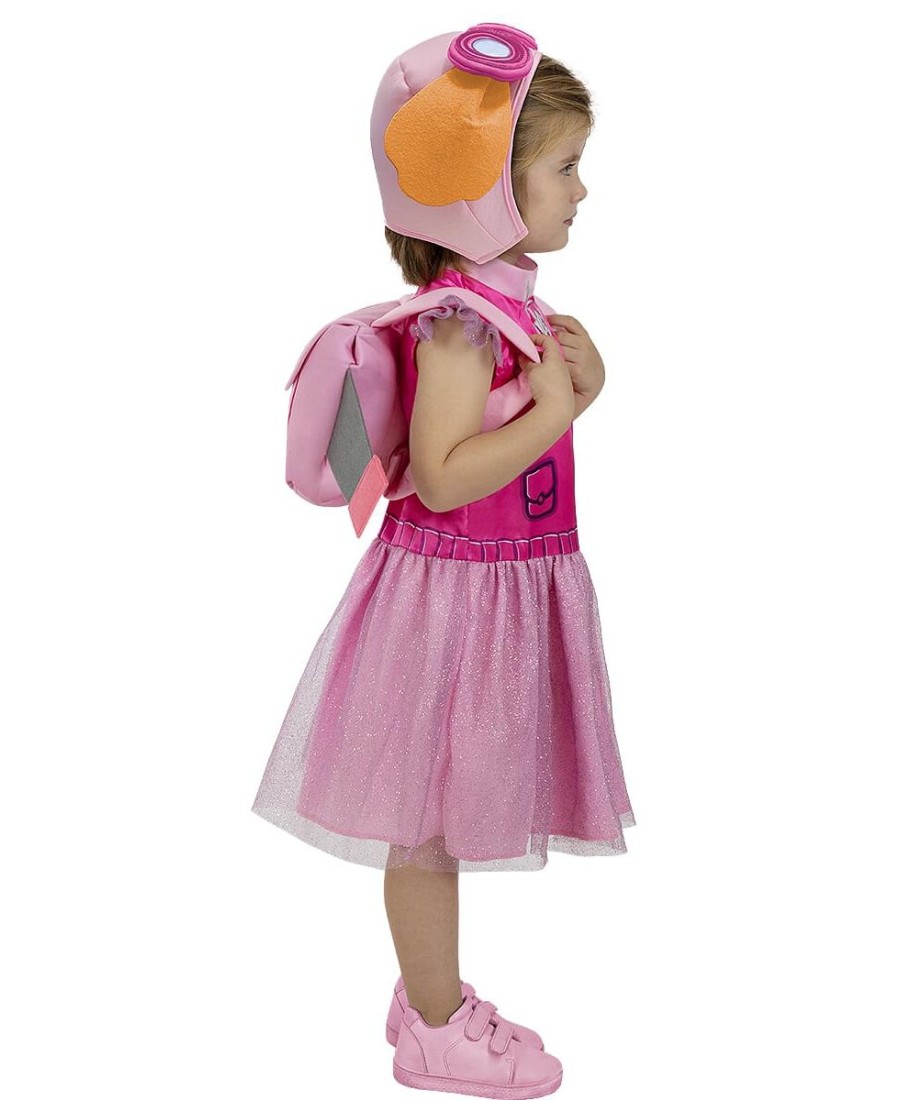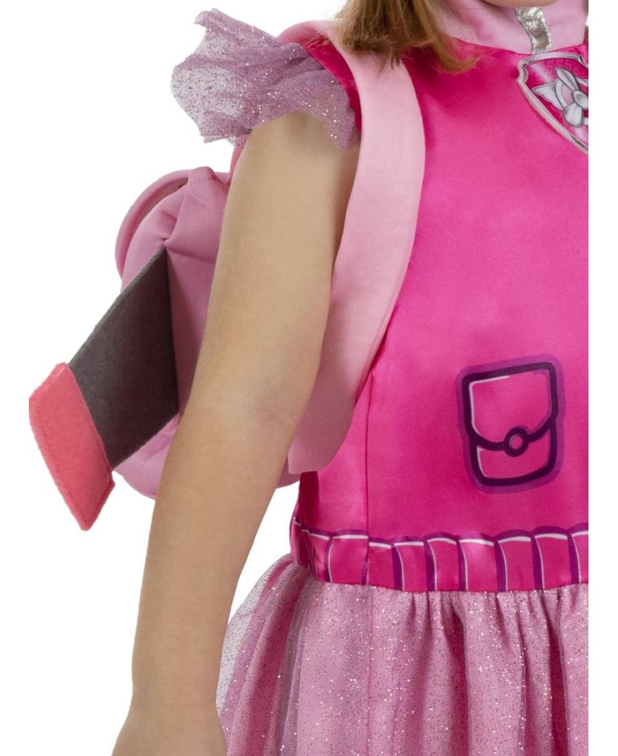 Incluye un vestido rosa brillante con falda de tul y detalles impresos, una mochila con alas integradas y un gorro con las icónicas orejas y gafas de vuelo de Skye. Su diseño cómodo y fácil de poner permite libertad de movimiento, siendo perfecto tanto para interiores como exteriores.