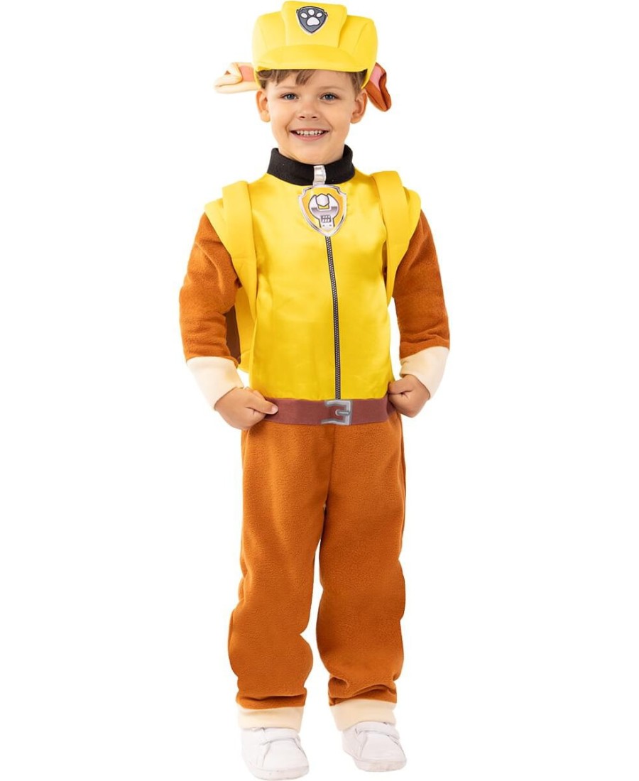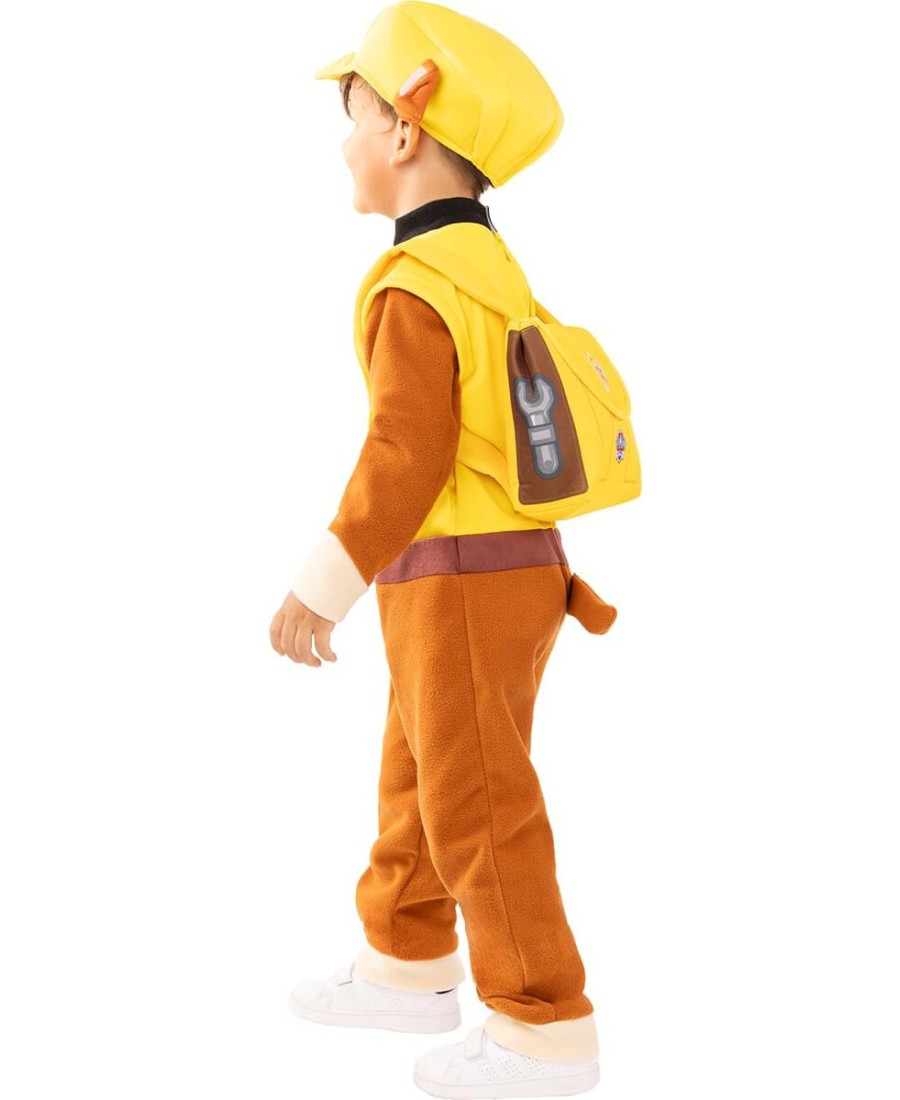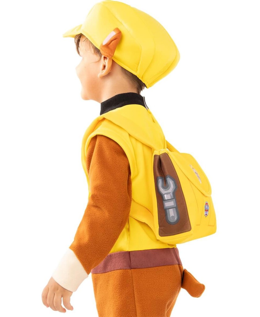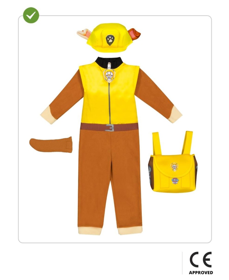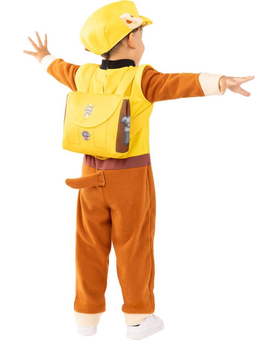 Incluye un mono marrón con parte superior amarilla y detalles impresos que simulan el uniforme del personaje. Se completa con una mochila blanda, una cola removible y una gorra amarilla con orejas integradas, lo que hace que el conjunto sea visualmente idéntico al look de Rubble en la serie.