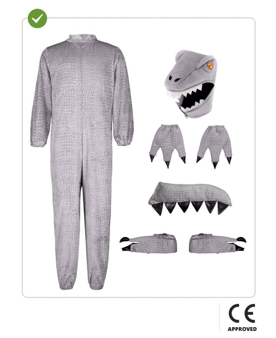 Incluye un mono de cuerpo entero con cierre frontal, cubrecalzado con forma de garras, cubremanos con forma de zarpas, cola acolchada con crestas y una capucha con cabeza de dinosaurio que cubre toda la parte superior, con ojos, dientes y hocico detallados. El conjunto está diseñado para cubrir de pies a cabeza y lograr un efecto impactante sin renunciar a la comodidad.