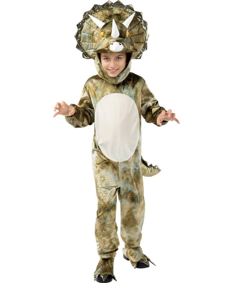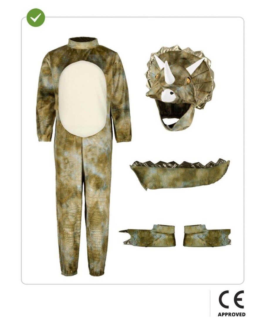 Haz que tu pequeño se transforme en una poderosa criatura prehistórica con este impresionante disfraz de triceratops para niño. Su diseño realista con estampado de escamas en tonos verdes y marrones, detalles de cuernos y gran gorguera en la cabeza, lo convierten en una elección ideal para Carnaval, fiestas temáticas, cumpleaños o simplemente para jugar en casa con mucha imaginación.