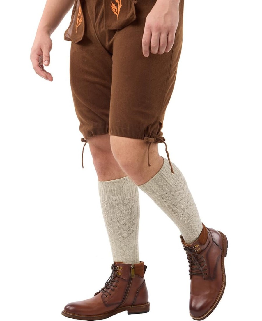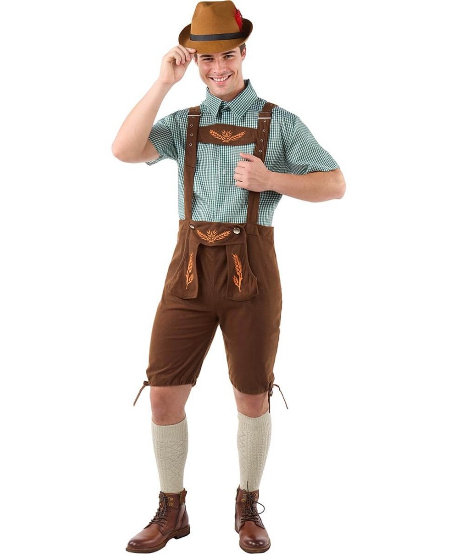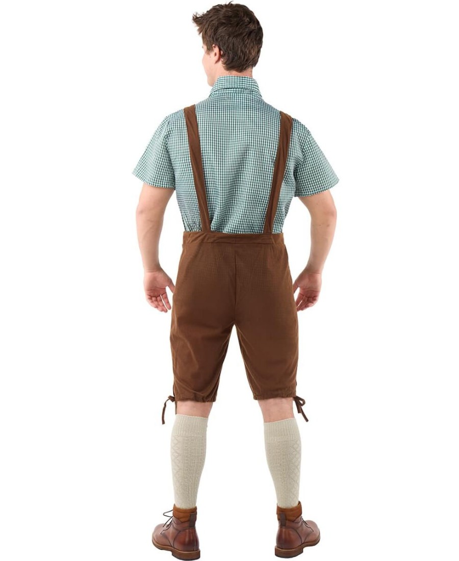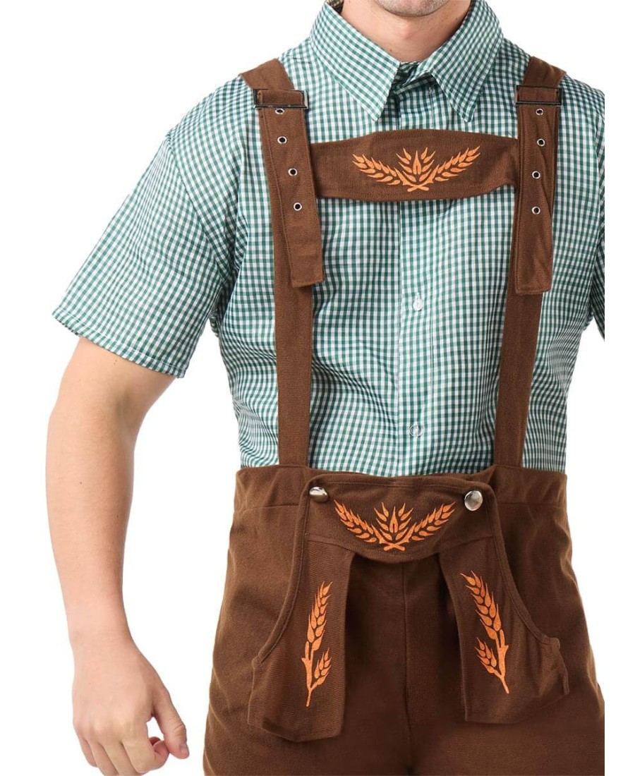 Este disfraz de Oktoberfest para adulto destaca por su camisa de manga corta de cuadros verdes, cómoda y fresca, combinada con un peto marrón con tirantes, calcetines altos tipo tirolés y un sombrero marrón con pluma, que completa el conjunto con estilo.