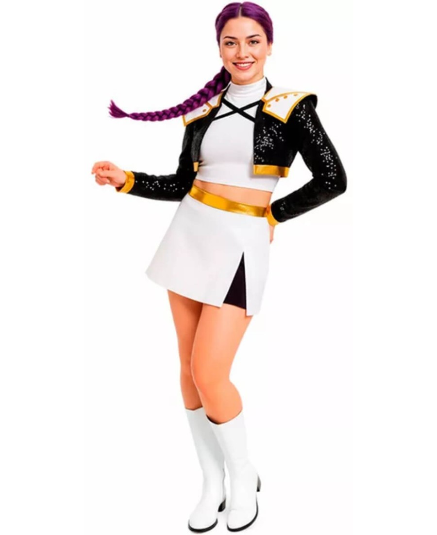 Forma parte de nuestro catálogo de disfraces K-pop mujer más populares, y se puede completar con botas altas blancas, maquillaje coreano y peinados con trenzas o coleta, típicos del estilo idol.