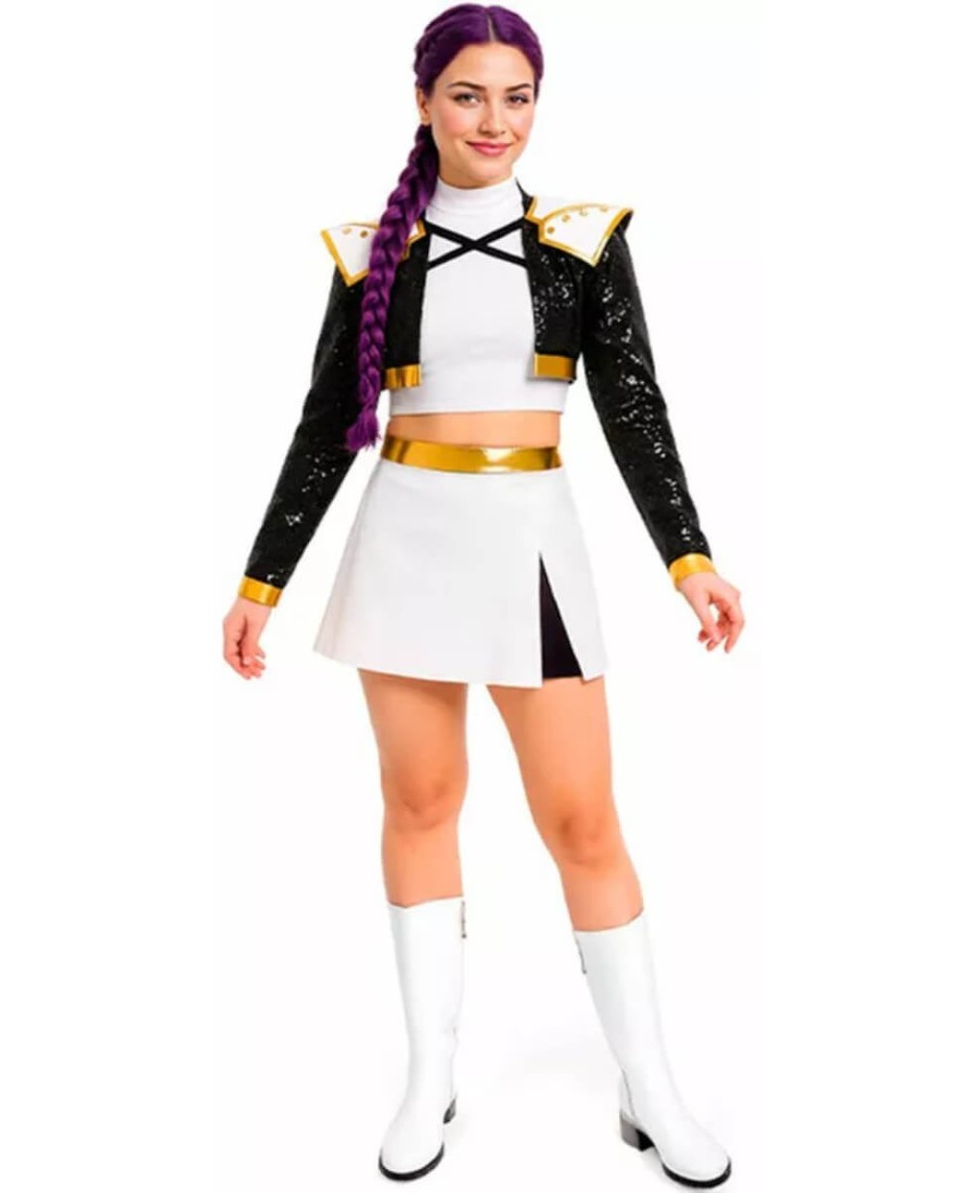 Entre los disfraces de K-pop, este modelo para mujer ofrece un equilibrio perfecto entre elegancia y tendencia. Su combinación de colores, detalles dorados y corte moderno lo convierten en una opción destacada para quienes buscan disfrazarse como una idol coreana.