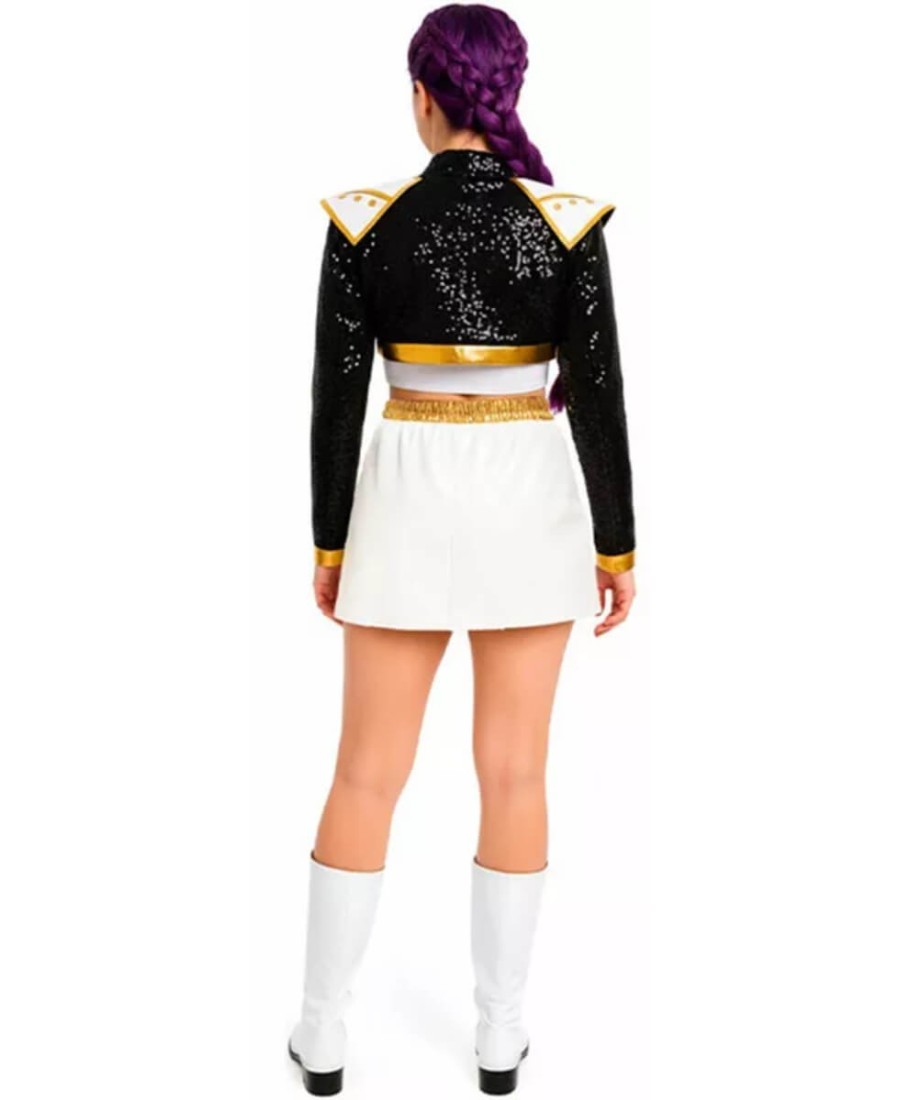 Compuesto por chaqueta corta negra con lentejuelas, top blanco de cuello alto y minifalda blanca con abertura, este disfraz de estilo K-pop es ideal para Carnaval, fiestas temáticas, coreografías o espectáculos. Un look rompedor que te hará sentir como una auténtica estrella del pop surcoreano.