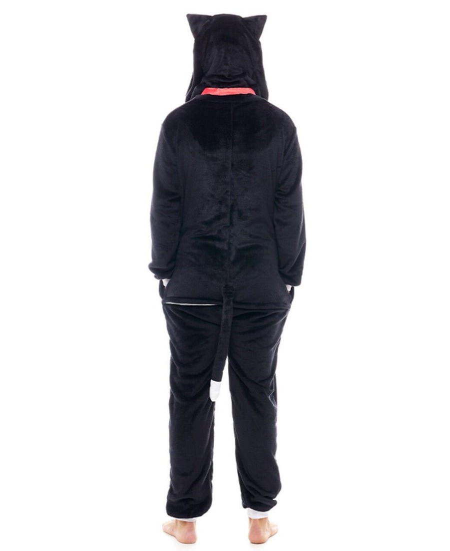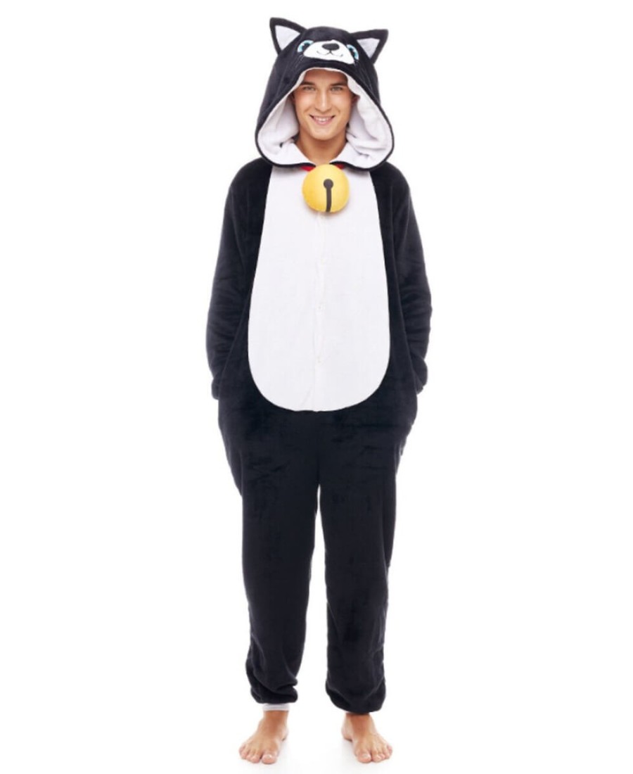 El diseño incluye un mono completo en color negro con detalle frontal en blanco y cierre delantero, además de capucha integrada con orejas y cara de gato . Incorpora también un cascabel decorativo en el cuello que aporta un toque simpático y realista al conjunto. Su tejido suave tipo peluche lo convierte en un disfraz muy confortable, perfecto para largas horas de fiesta.