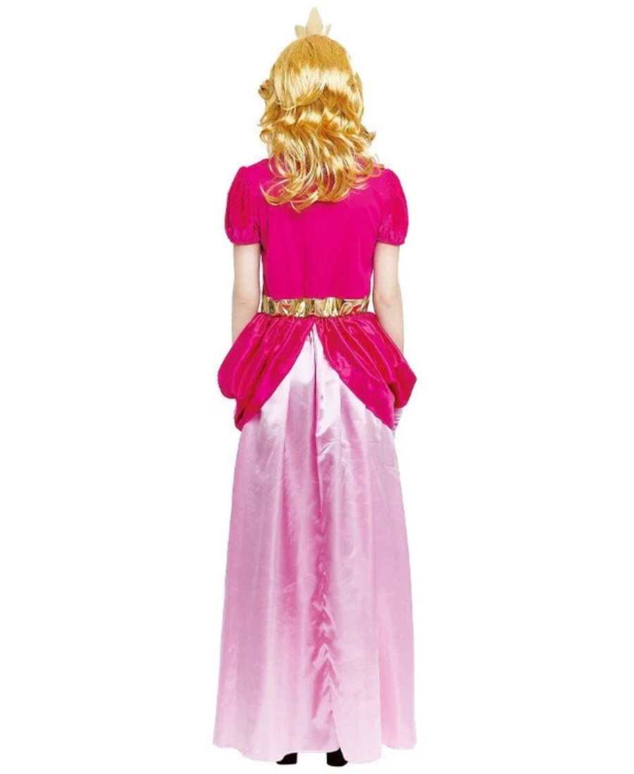 Este disfraz de princesa rosa destaca por su vestido largo en tonos rosa claro y fucsia, con cuerpo ajustado y detalles dorados que aportan un acabado real. El conjunto se completa con la tiara que evocan el estilo inconfundible del personaje, creando un look perfecto para quienes buscan un disfraz de princesa de videojuego elegante y llamativo.