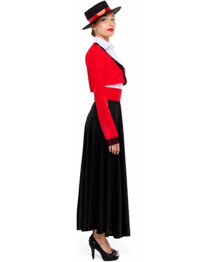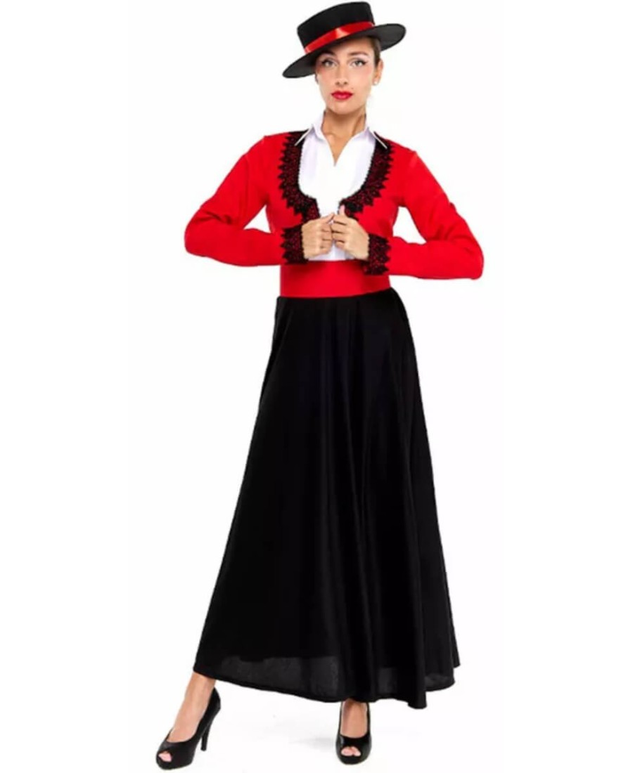 Este disfraz andaluz para mujer recrea el estilo típico de feria con una chaqueta roja decorada con detalles en negro, camisa blanca interior y falda larga negra que aporta movimiento y elegancia. El conjunto se completa con cinturón a juego, logrando un look equilibrado y tradicional ideal para eventos de temática española.