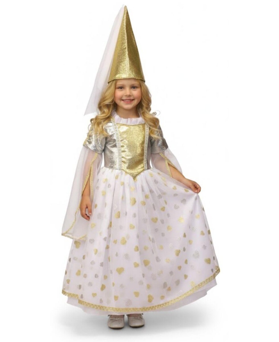 Haz que cualquier ocasión se convierta en un cuento de hadas con este delicado disfraz de princesa para niña. Este vestido, con tonos blancos y detalles dorados, refleja elegancia y fantasía, pensado para niñas que sueñan con sentirse especiales desde el primer momento.