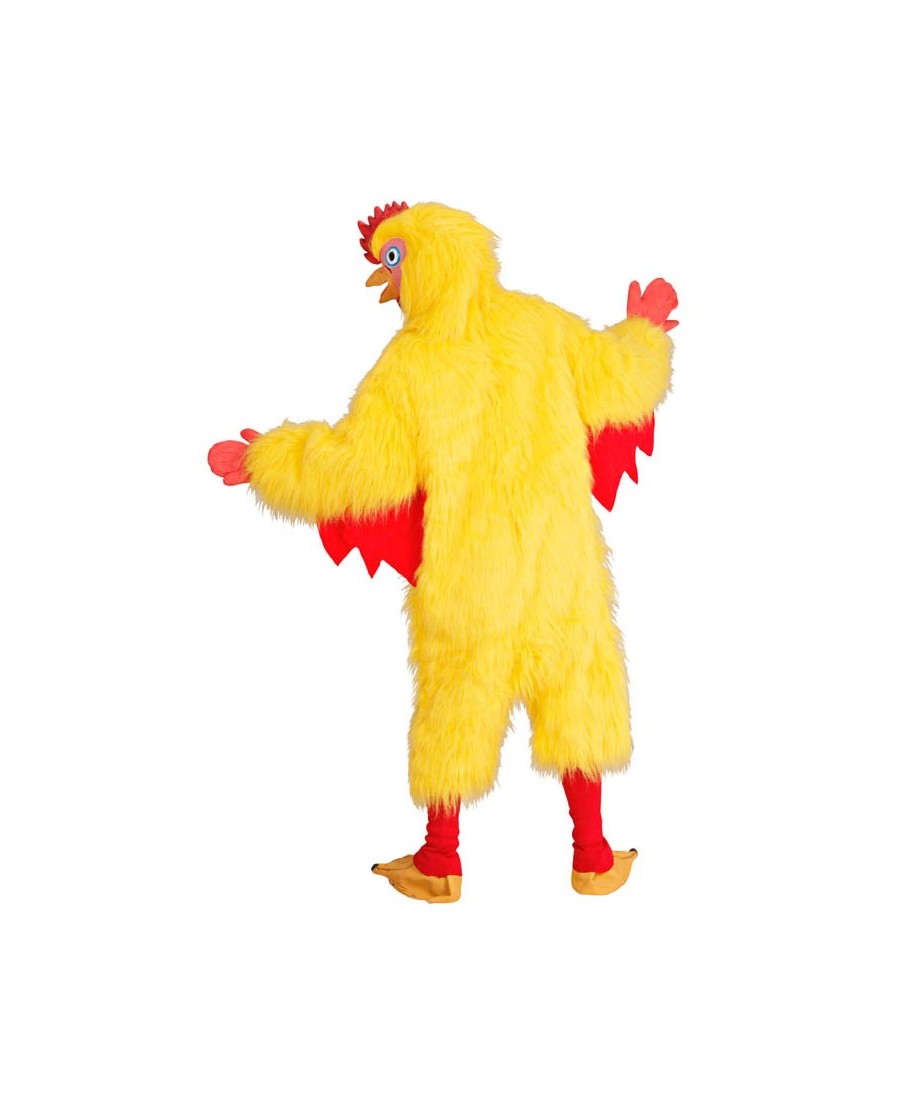 Este traje recrea un simpático gallo con un diseño voluminoso y colorido que recuerda a los clásicos disfraces de mascota.