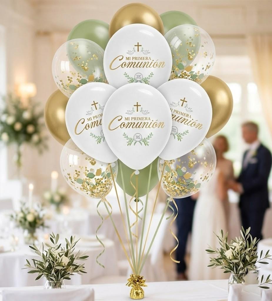 Algunos globos incluyen ilustraciones relacionadas con la ceremonia, como cruces, palomas o pequeños motivos religiosos. Este tipo de diseños encajan muy bien en celebraciones de estilo más clásico.