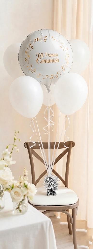 Para darle un toque más delicado, muchas decoraciones de comunión combinan globos con pequeñas flores artificiales o elementos vegetales. Este tipo de detalles aporta un aire más natural y elegante a la composición.